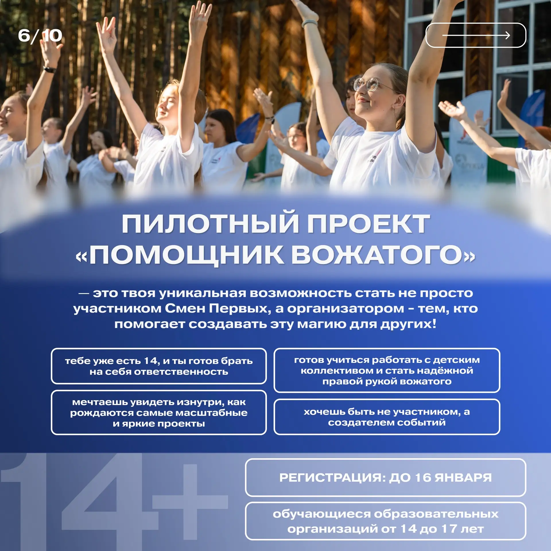 ⚡ Твоя летняя Смена Первых может стать по-настоящему особенной, если ты будешь не просто участником, а тем, кто помогает создавать эту магию для других! Собеседование, специальное обучение и, конечно, незабываемая практика в самой гуще событий ждёт тебя в проекте «Помощник вожатого»