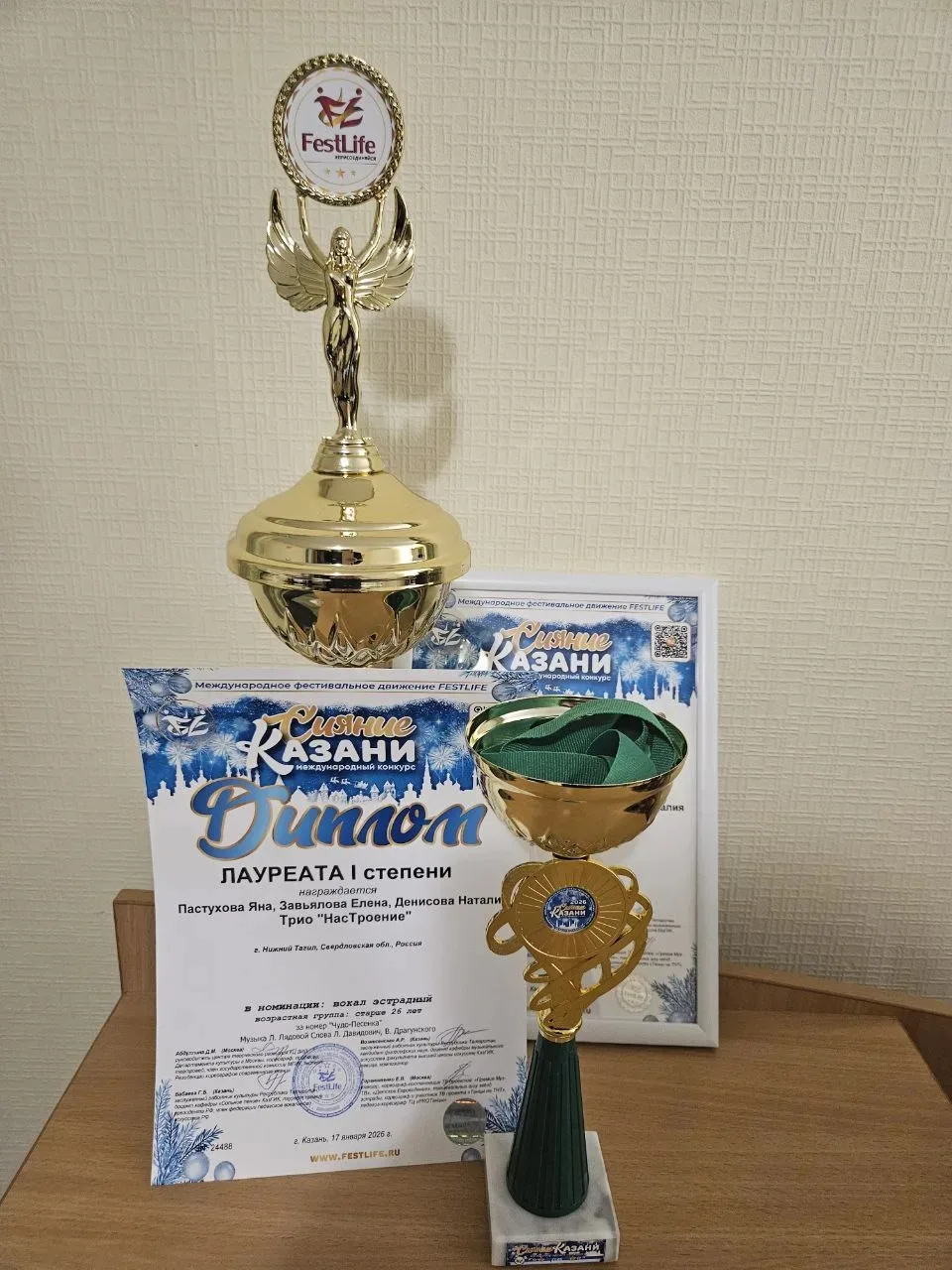🏆Результатом их упорного труда и артистизма стала очередная победа – звание лауреатов I степени! Более того, впервые трио "НасТроение" было удостоено специального приза жюри – Большого Кубка "Сияние Казани"!