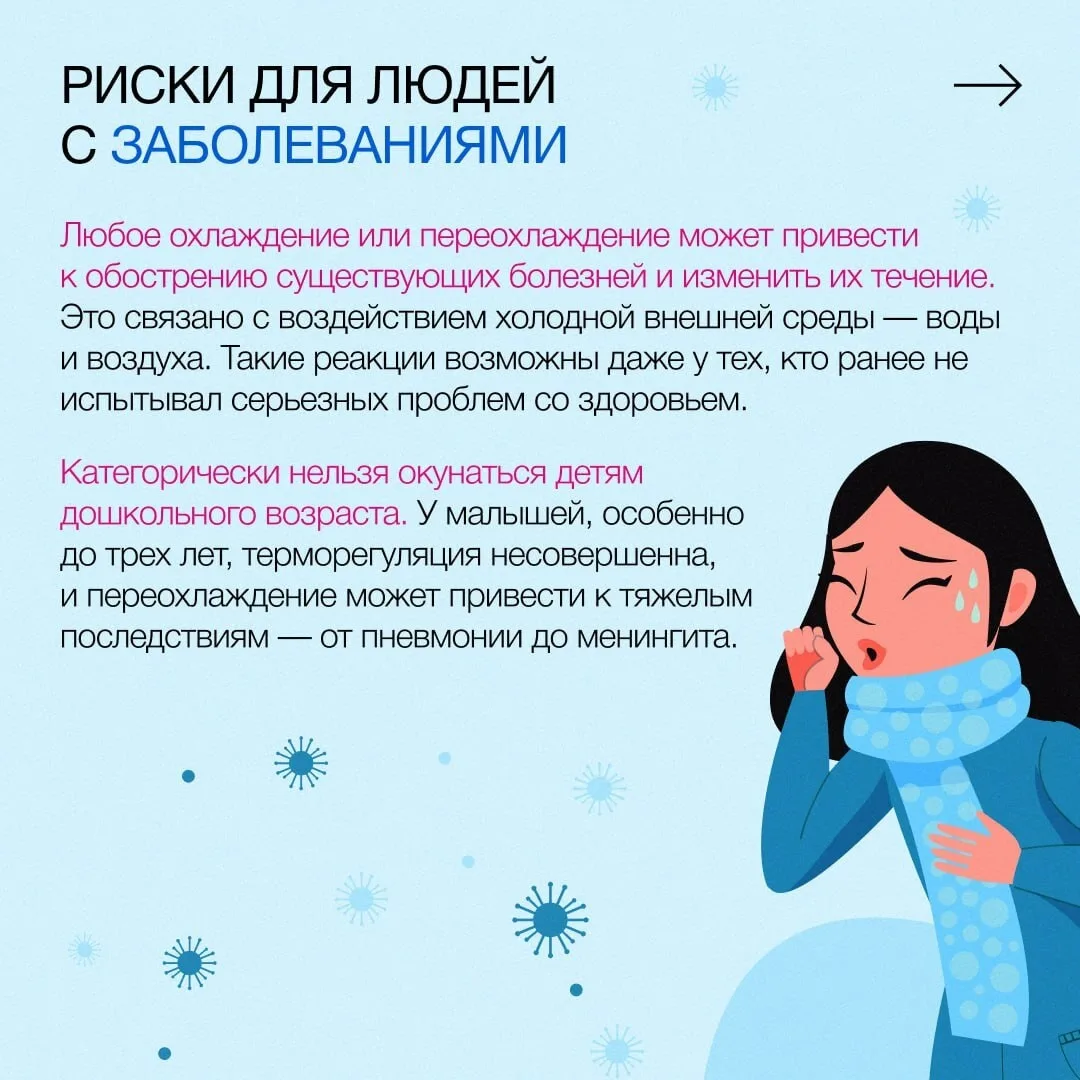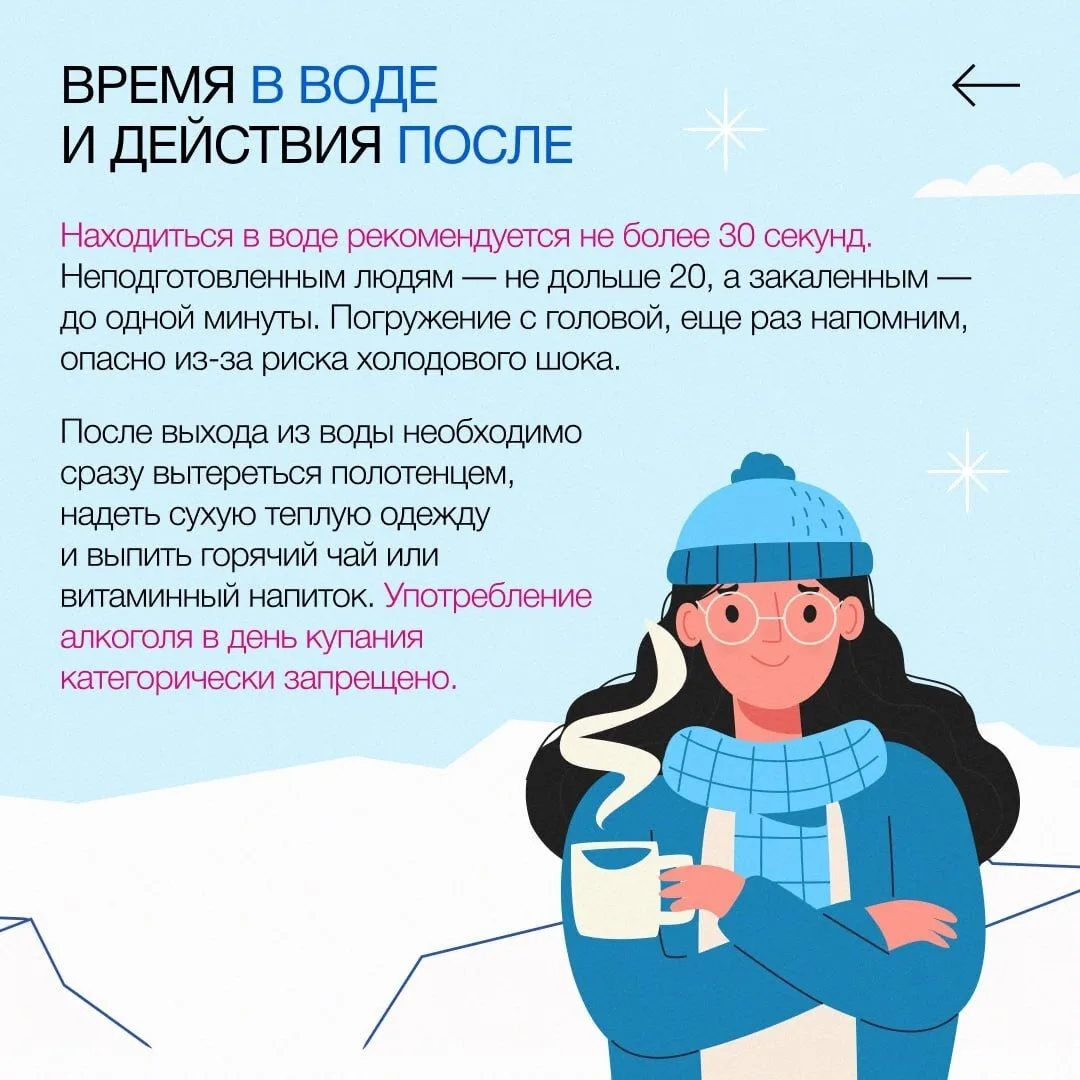 💦 В ночь с 18 на 19 января, в праздник Крещения, многие по традиции отправятся к купелям. Такой обряд имеет глубокий духовный смысл. Но не забывайте, что это еще и серьезное испытание для организма. Чтобы погружение в купель принесло пользу, а не проблемы со здоровьем, читайте рекомендации в карточках. Готовьтесь к купанию осознанно и без лишнего риска.