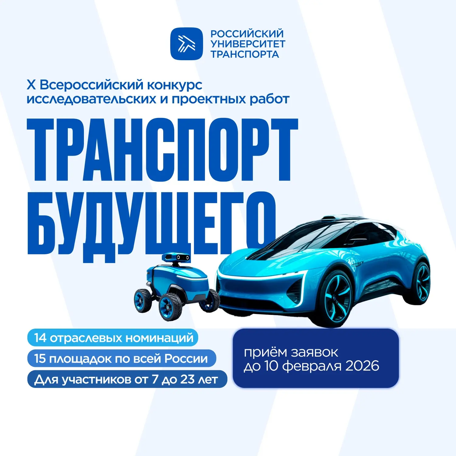 Открыт приём заявок на «Транспорт будущего» - Всероссийский конкурс исследовательских и проектных работ. Участвовать могут школьники и студенты колледжей и вузов в возрасте до 23 лет включительно.