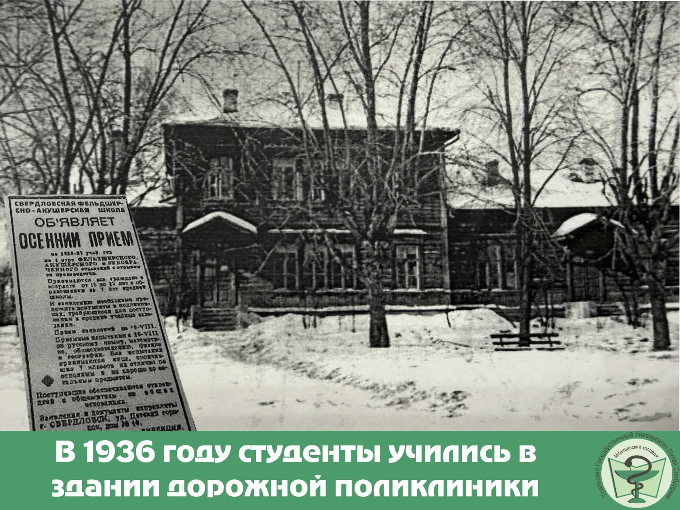 🏥Своего помещения у недавно появившейся школы, конечно, еще не было. Студенты проходили обучение в стенах дорожной поликлиники. А несколько деревянных зданий на улице Стрелочников стали местом, где осваивали теорию и сразу закрепляли всё на практике.