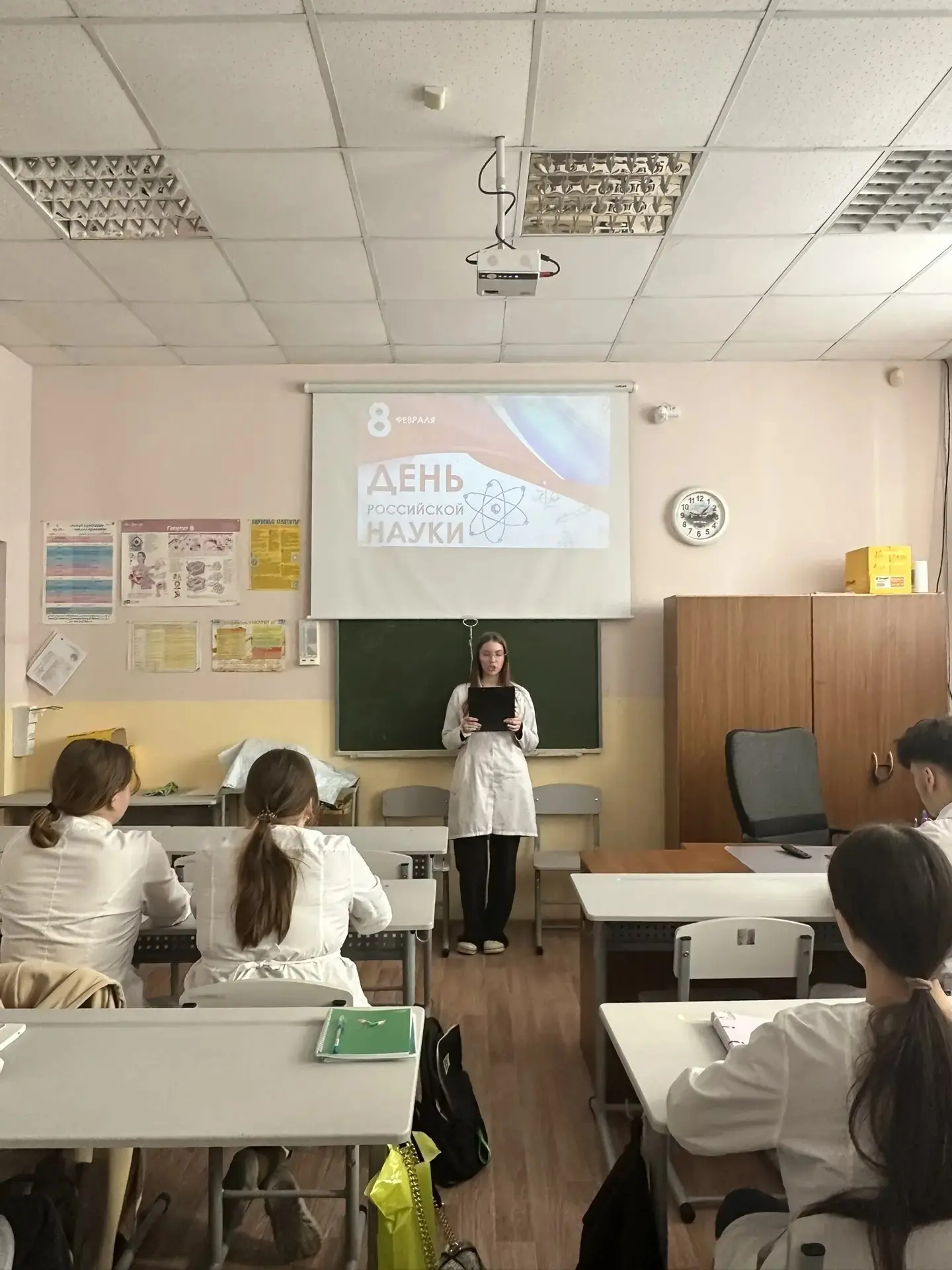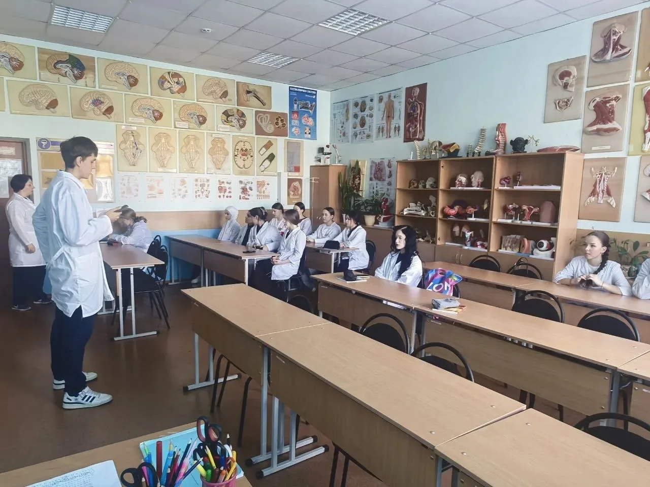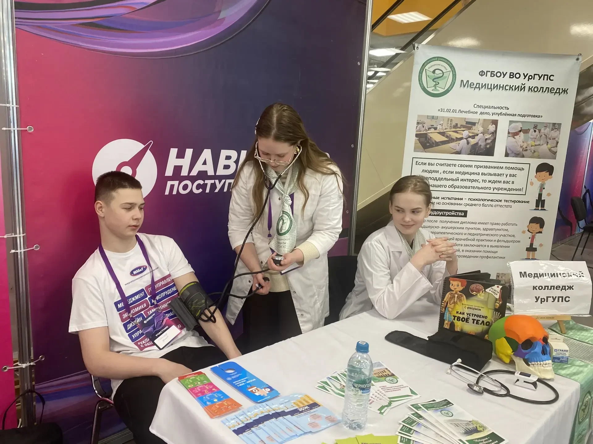 Особый интерес — к «медицинской наглядности»: будущие коллеги разглядывали череп и фонендоскоп, спрашивали о поступлении после 9 и 11 классов и трудоустройстве.