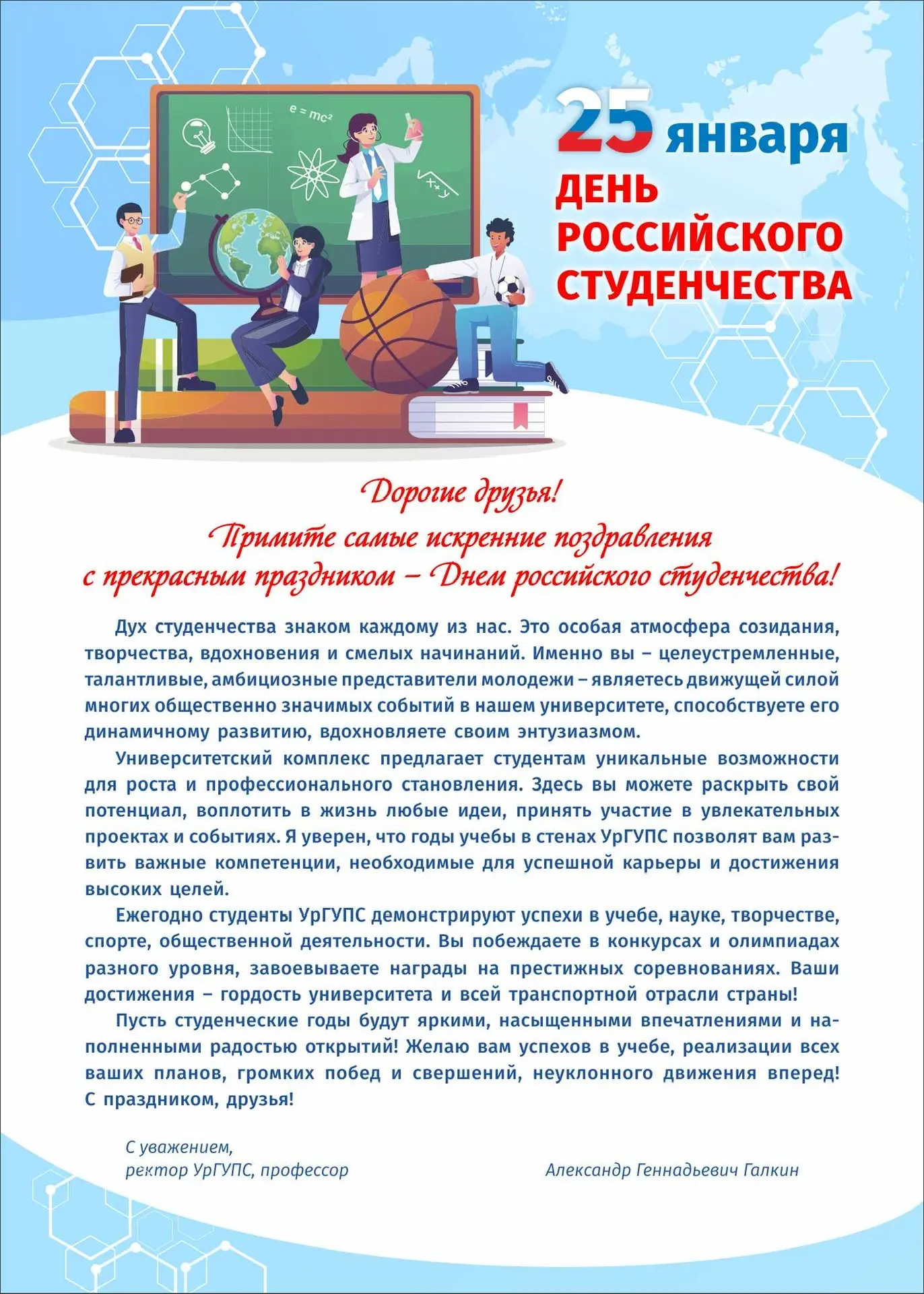 🎉 Дорогие студенты УрГУПС, сердечно поздравляем вас с Татьяниным днем! Пусть этот особенный праздник наполнит вашу жизнь яркими впечатлениями, вдохновением и радостью! Желаем вам лёгкой учёбы, увлекательных открытий, верных друзей и успешного воплощения всех ваших амбиций! Вы - наше гордое будущее!