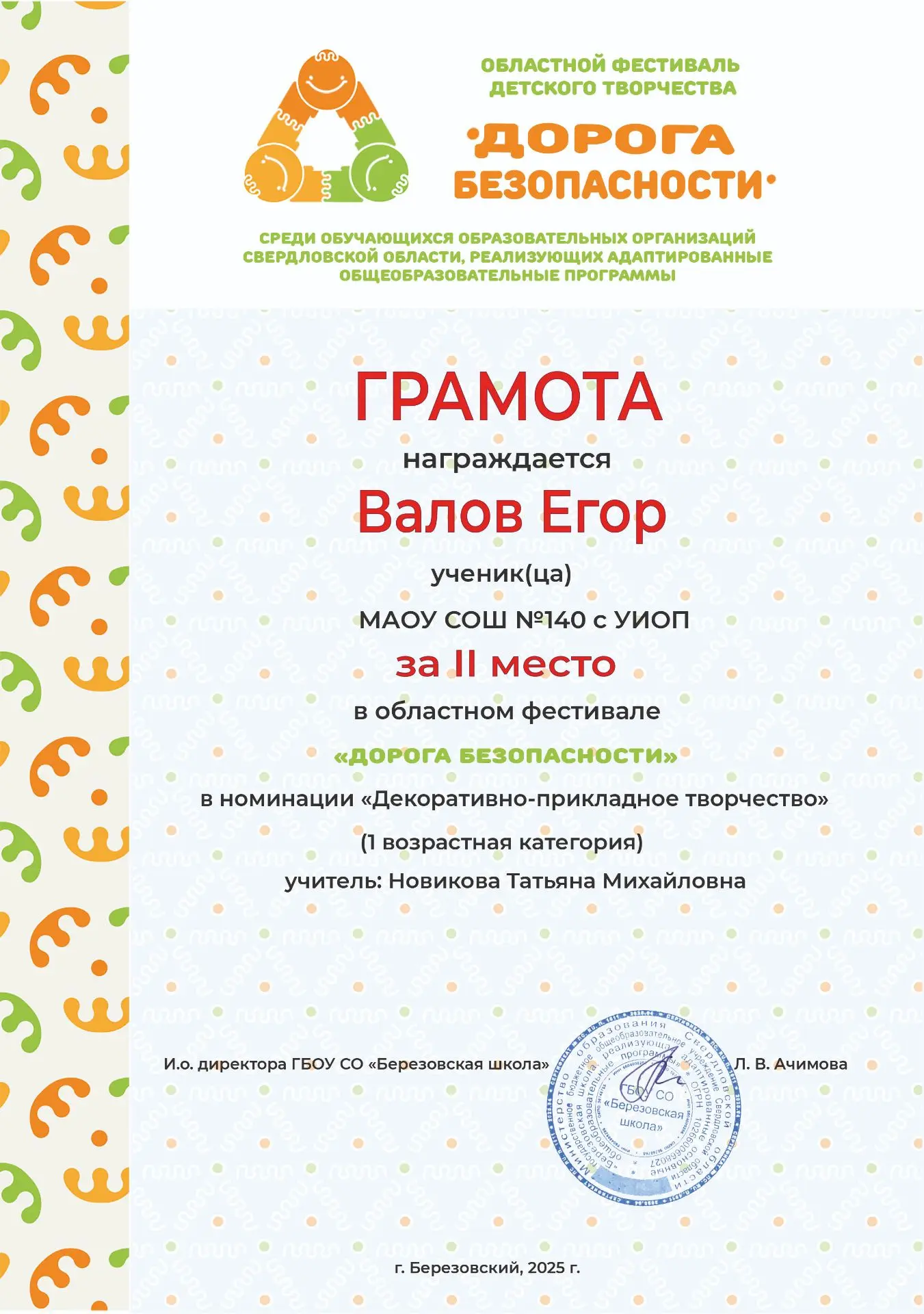🎉Поздравляем Валова Егора, ученика 1Б класса, получившего грамоту за