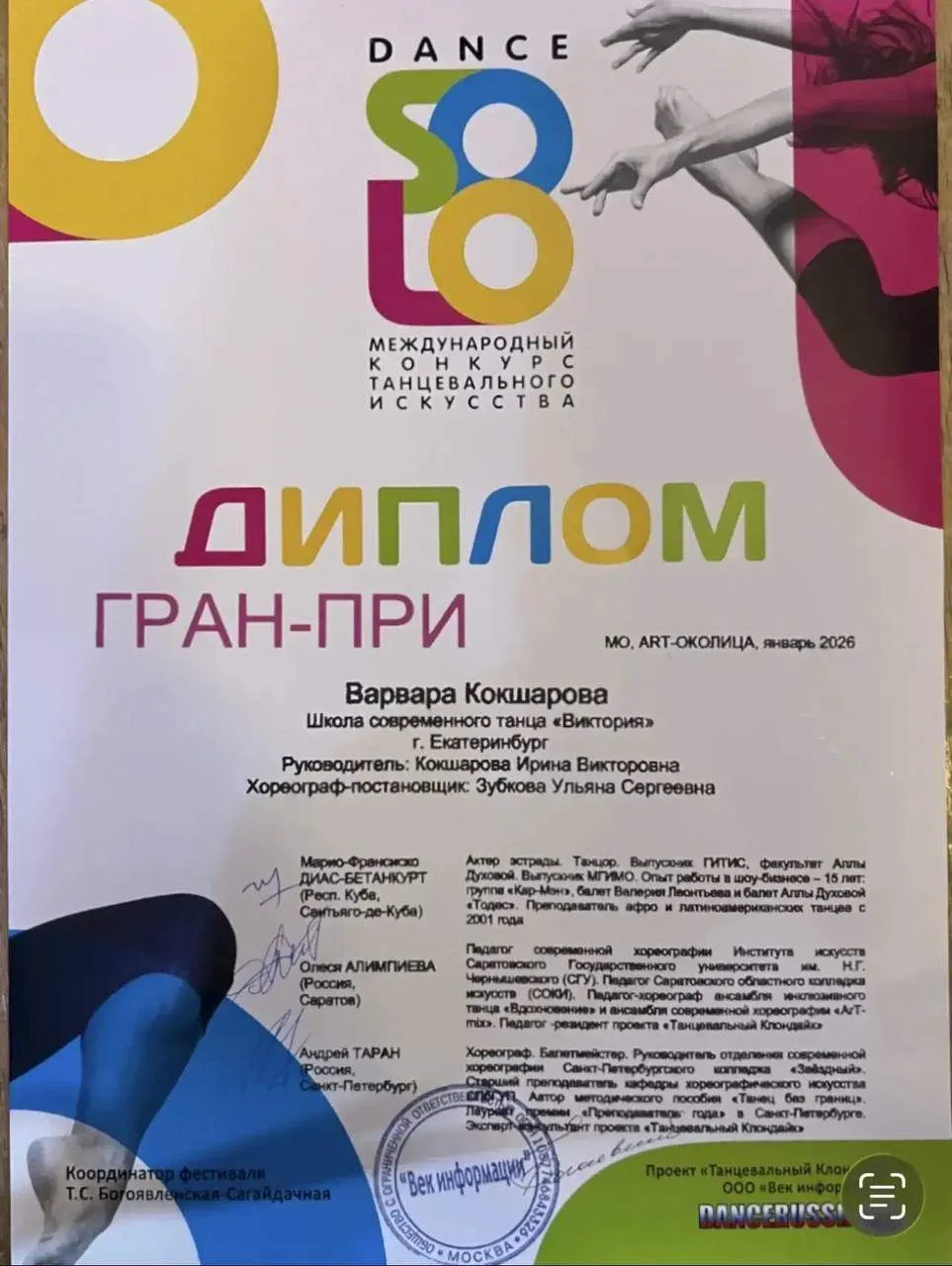 Кокшарова Варвара, ученица 8 б класса МАОУ СОШ 140, стала абсолютным победителем международного конкурса DANCE SOLO, г. Москва получив высшую награду ГРАН-ПРИ в возрастной категории 14-17 лет. А также получила высокую оценку и личное признание-комплимент от члена жюри Марио-Франсиско Диас-Бетанкурт( респ. Куба)
