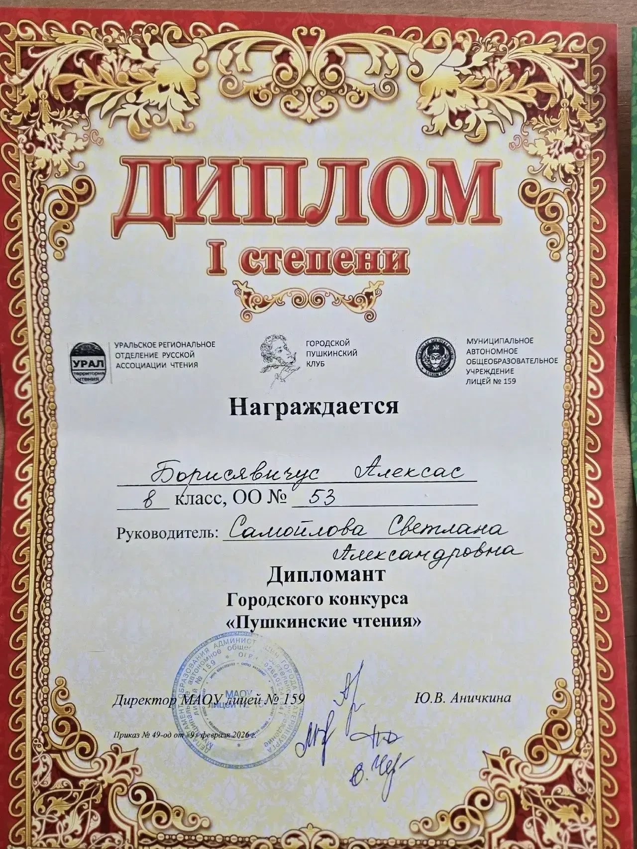 Борисявичус Алексас (8 Б) — 1 место! Особая благодарность Самойловой Светлане Александровне за подготовку и поддержку!