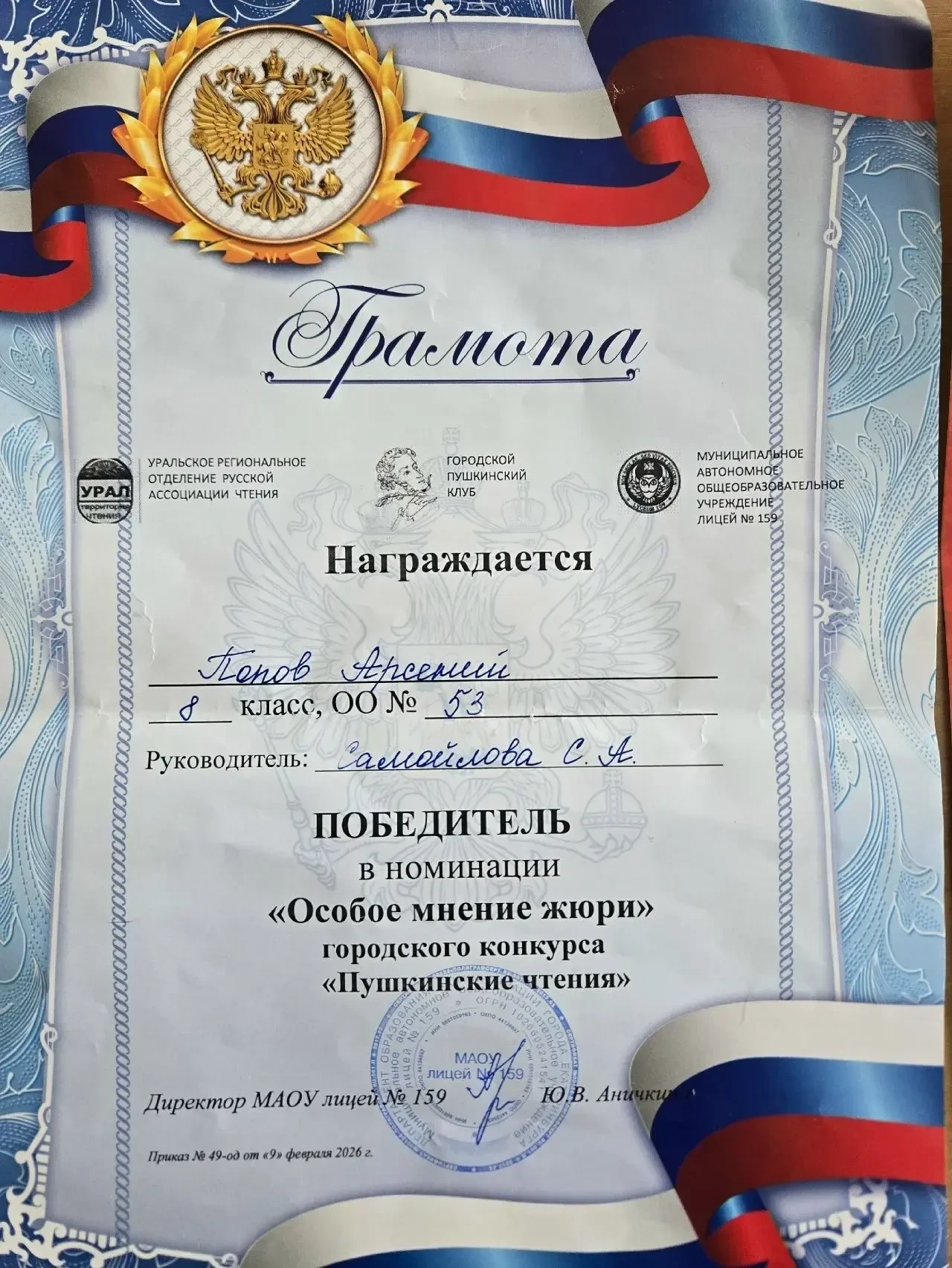 Попов Арсений (8 Б) — Номинация "Особое мнение жюри"!