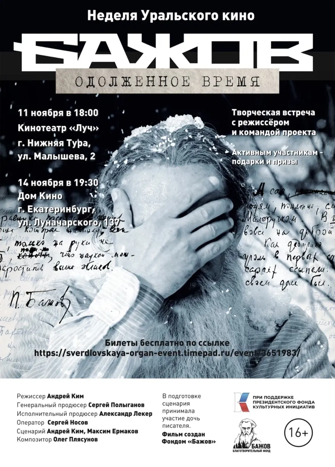 👉полнометражный художественный фильм о жизни П. П. Бажова - «Бажов. Одолженное время» (производство «Фонд БАЖОВ», режиссёр Андрей Ким).