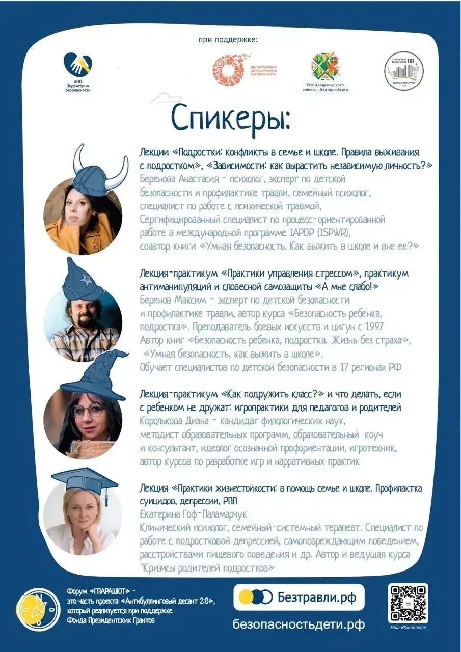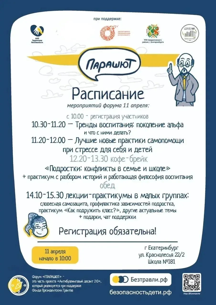 Я, Анастасия Беренова (психолог, эксперт по детской безопасности и работе с травлей, автор книг), создатель и ведущая форума для педагогов и родителей "Парашют" обращаюсь здесь лично к каждому и приглашаю вас в субботу 11 апреля на наше мероприятие. Регистрация тут: forms.yandex.ru/u/69b8fdab...