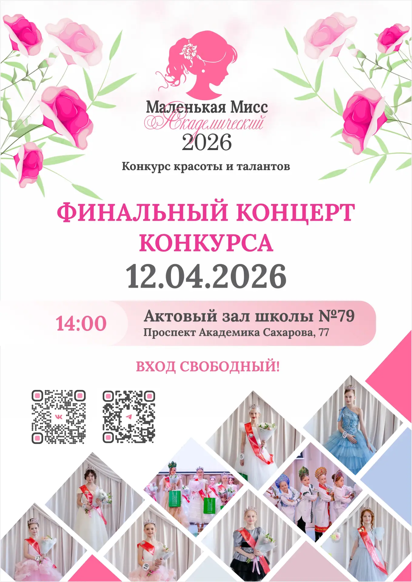 🌟Напоминаем, что сам конкурс состоится уже сегодня в 14:00 в МАОУ СОШ 79. Зрителям необходимо зарегистрироваться: https://ekb.qtickets.events/228713-final-konkursa-malenkaya-miss-akademicheskiy-2026