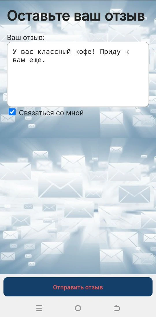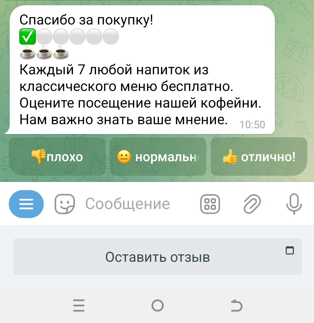 Наша команда постоянно работает на продуктом, чтобы сделать его более полезным для вас. Представляем вашему вниманию два варианта обратной связи от ваших гостей. В первом варианте гость может поставить оценку после покупки. Статистика по этим оценкам отражается в дневном отчете. Во втором варианте гость может отправить произвольное сообщение владельцу кофейни и при необходимости попросить связаться с ним.