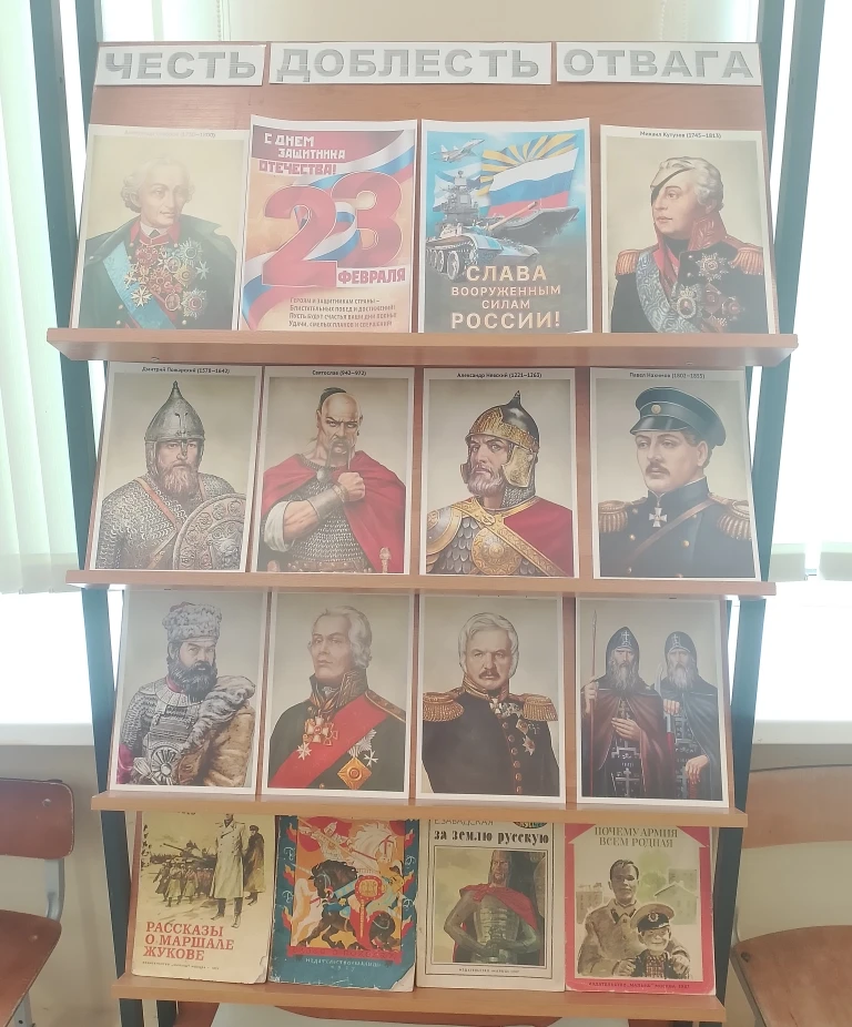 📝На стенде «Славные защитники Отечества» соседствуют портреты гениев сухопутных сражений и морских баталий. Здесь можно увидеть:
