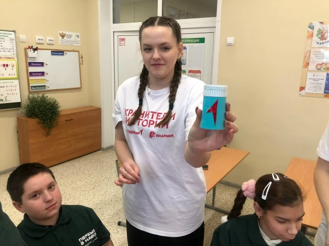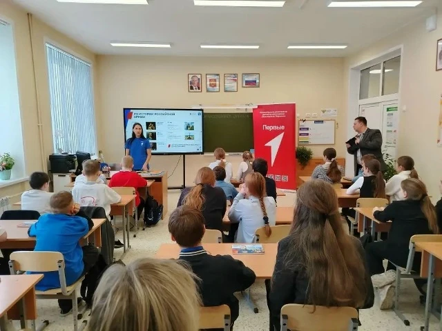🇷🇺Наталья Галимжановна, председатель совета местного отделения Движения Первых провела исторический экскурс и рассказала о развитии российской армии, современных вооруженных силах РФ и внутренней безопасности государства, также подчеркнула значимость наград и званий Героев Российской Федерации.
