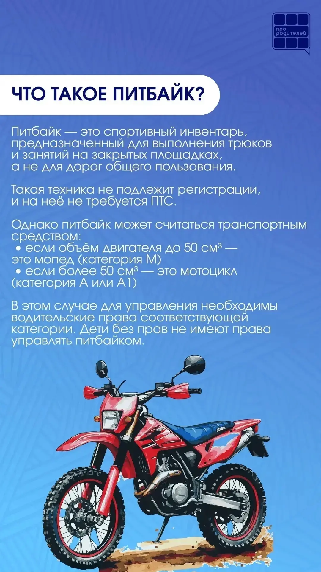 🔹 Лёгкий, быстрый, «как у взрослых» — питбайк всё чаще становится желанным подарком для подростков. Родителям кажется: пусть лучше катается, чем сидит в телефоне. Но здесь важно не перепутать хобби с реальной угрозой. Потому что за этим «безобидным увлечением» могут стоять травмы, серьёзные последствия… и ответственность, о которой многие даже не задумываются.