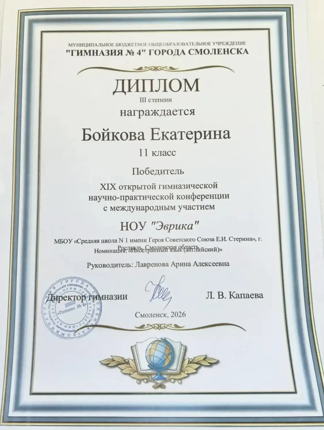 👍Поздравляем обучающуюся 11 класса Бойкову Екатерину с ПОБЕДОЙ в номинации "Иностранный язык ( английский)"🥇🥇🥇