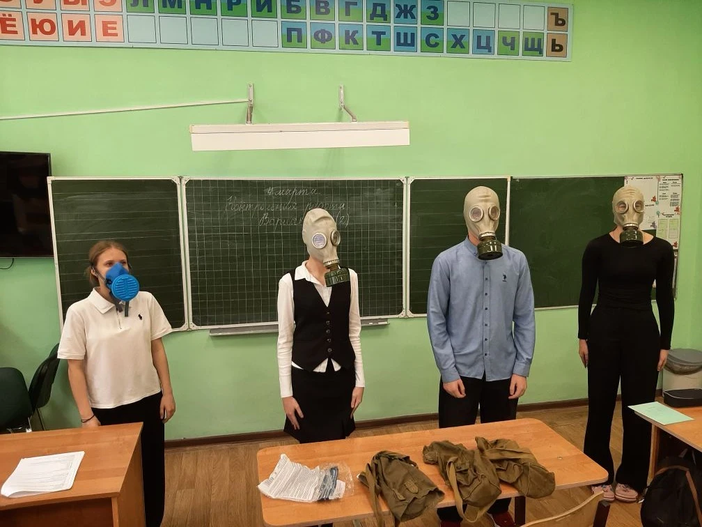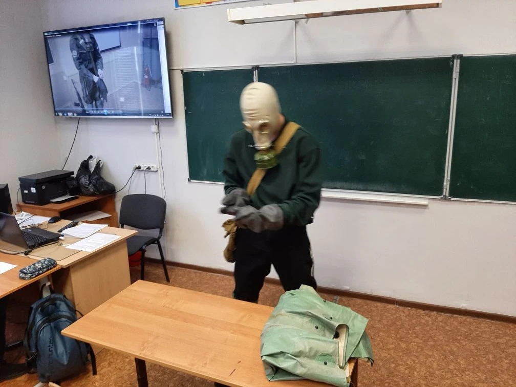 Практические занятия по надеванию противогаза — школьники отработали алгоритм действий и научились правильно использовать средства индивидуальной защиты.