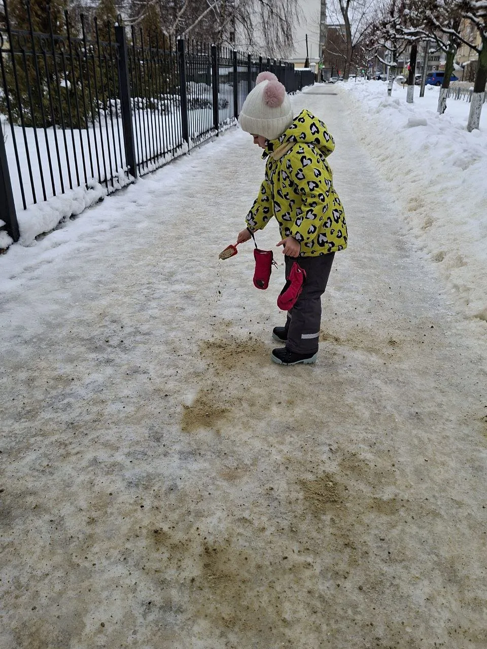 Наши юные волонтёры вышли на улицу, добросовестно обработали участок тротуара и тем самым сделали город чуть безопаснее и комфортнее. К работе пожелали присоединиться и дошкольники, которые в это время проходили мимо.