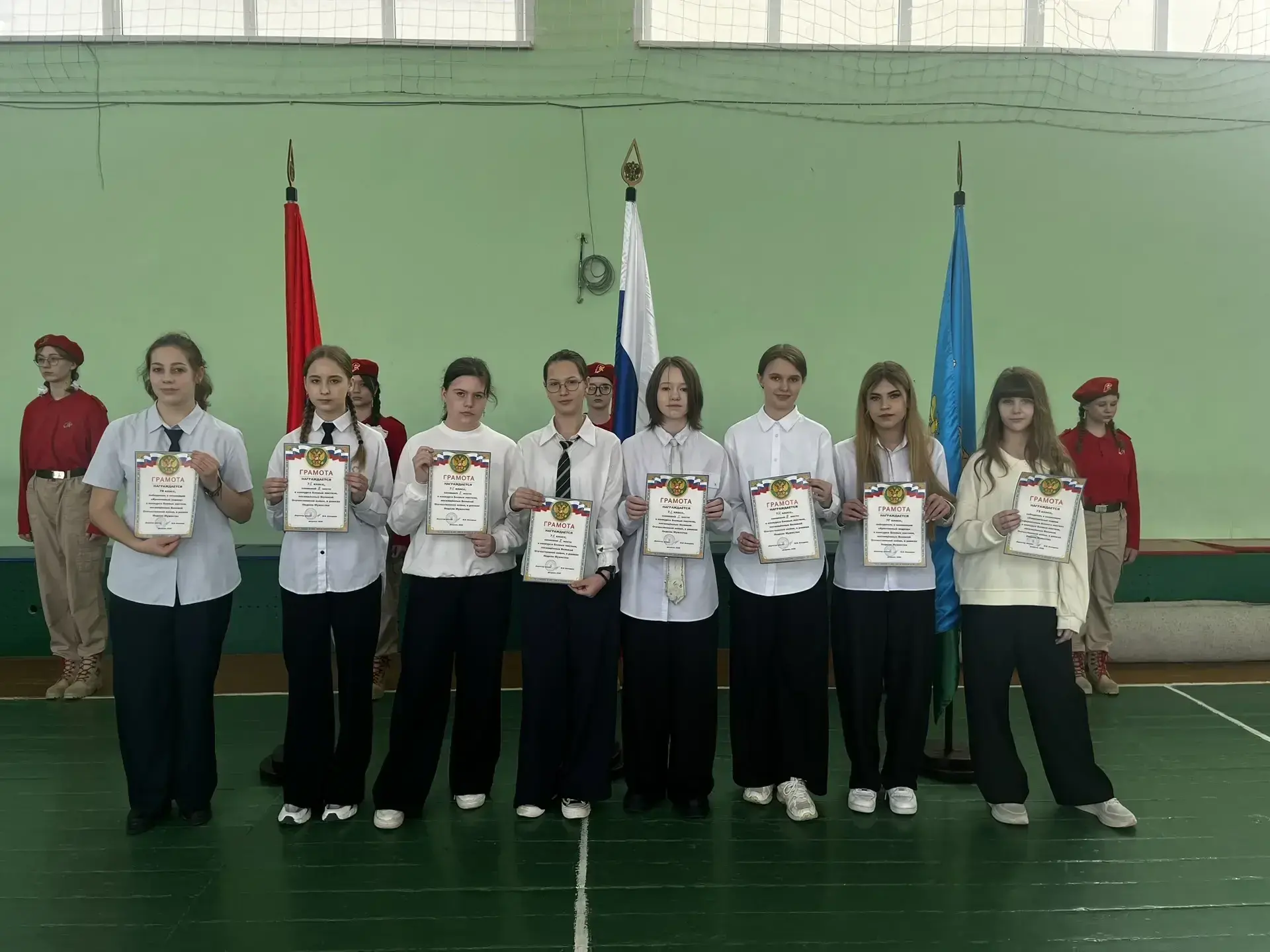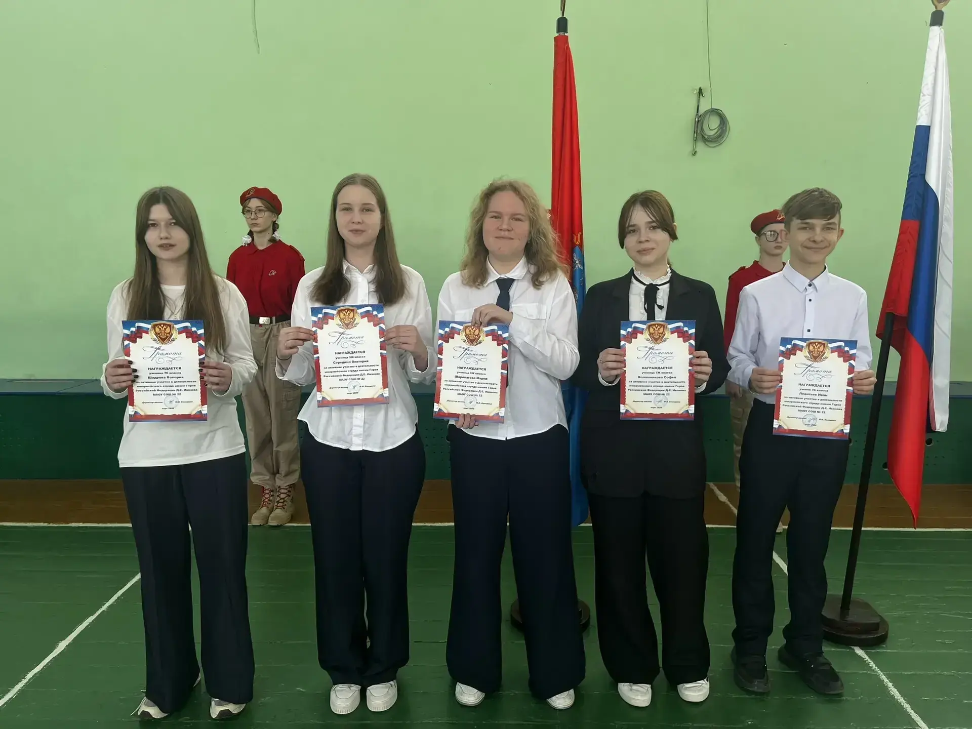 самых активных юнармейцев школы — они получили заслуженные грамоты за вклад в патриотическое воспитание и активную гражданскую позицию;