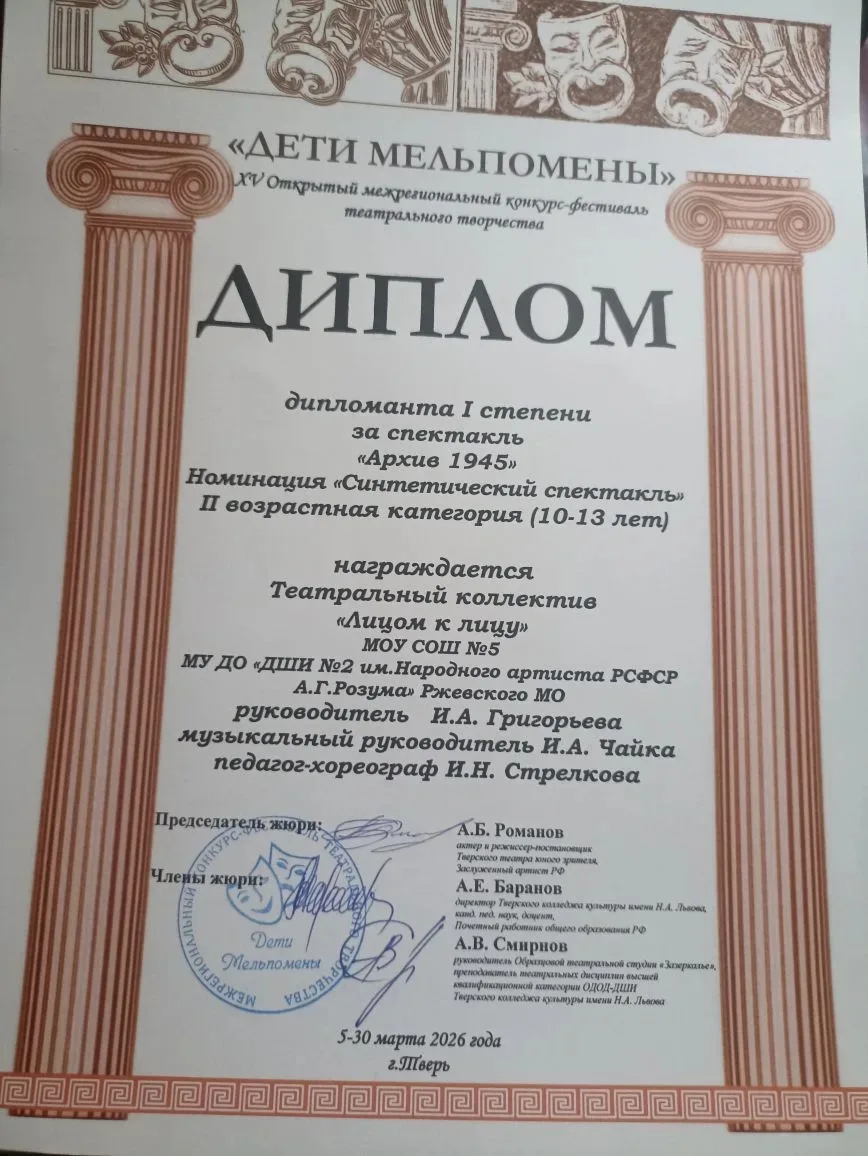 🎭👯Особой гордостью для нас стало выступление совместного проекта — воспитанников школьной театральной студии «Лицом к лицу» МОУ "СОШ №5" и ДШИ № 2 им. А. Г. Розума. Юные артисты и хореографы в возрасте от 10 до 13 лет представили на суд жюри пронзительную постановку «Архив 1945». Их игра, глубина проживания материала и слаженность ансамбля были отмечены высшей наградой — ребята стали дипломантами I степени в своей возрастной категории в номинации "Синтетический спектакль" ! 🏆