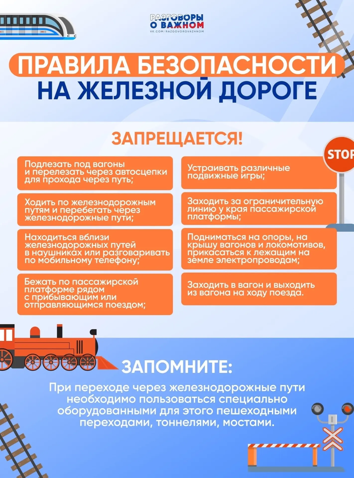 Мы подготовили памятку, как правильно себя вести на железной дороге и избежать неприятных происшествий!