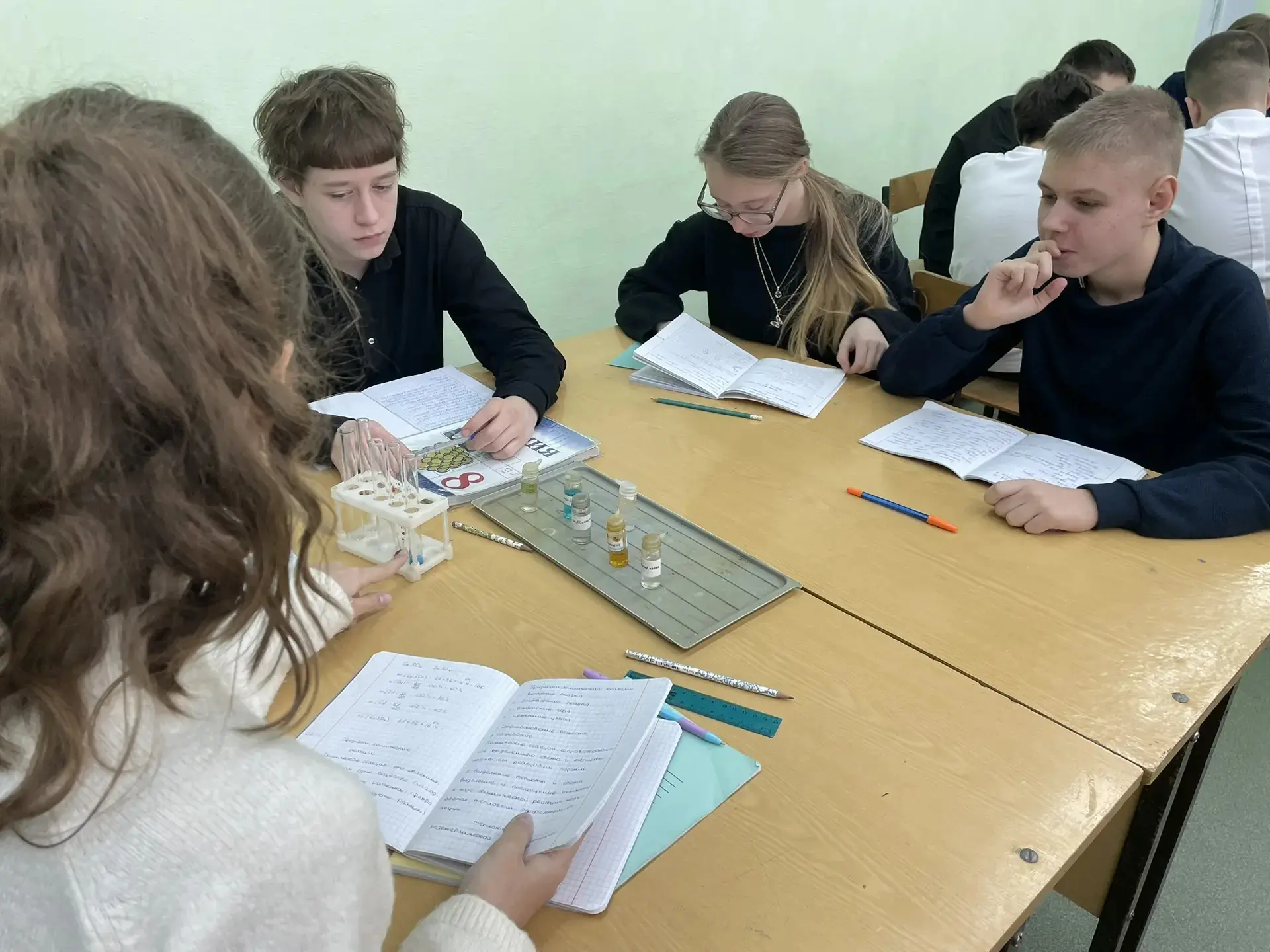 Провели лабораторную работу по изучению признаков химических реакций. Группы исследовали выпадение осадков, выделение газов и изменение цветов при взаимодействиях разных веществ.