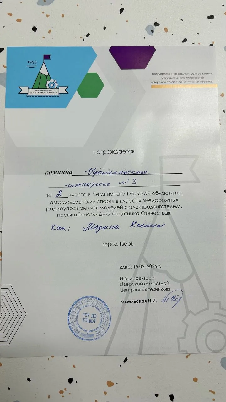 15 февраля 2026 года на закрытой площадке МБУ ДО «Дворец творчества детей и молодёжи» г. Тверь состоялся Чемпионат Тверской области по автомодельному спорту в классах внедорожных радиоуправляемых моделей с электродвигателем, посвящённом Дню защитника отечества. Команда АТОМКЛАССА гимназии, под руководством педагога дополнительного образования П.П. Карнаухова, приняла активное участие и заняла достойное 2 место. Поздравляем команду (капитан Модина Ксения) с победой и желаем ей дальнейших успехов и побед!