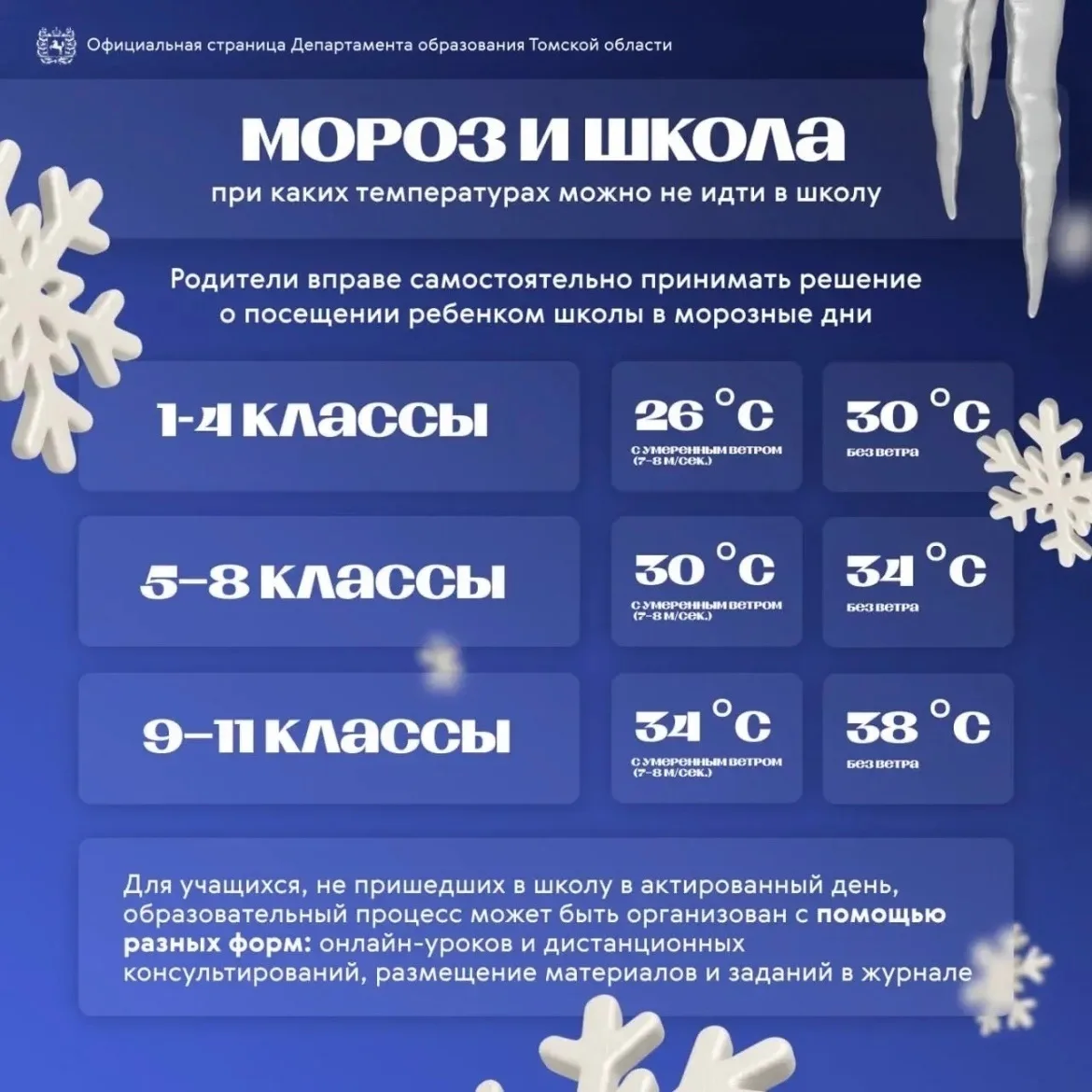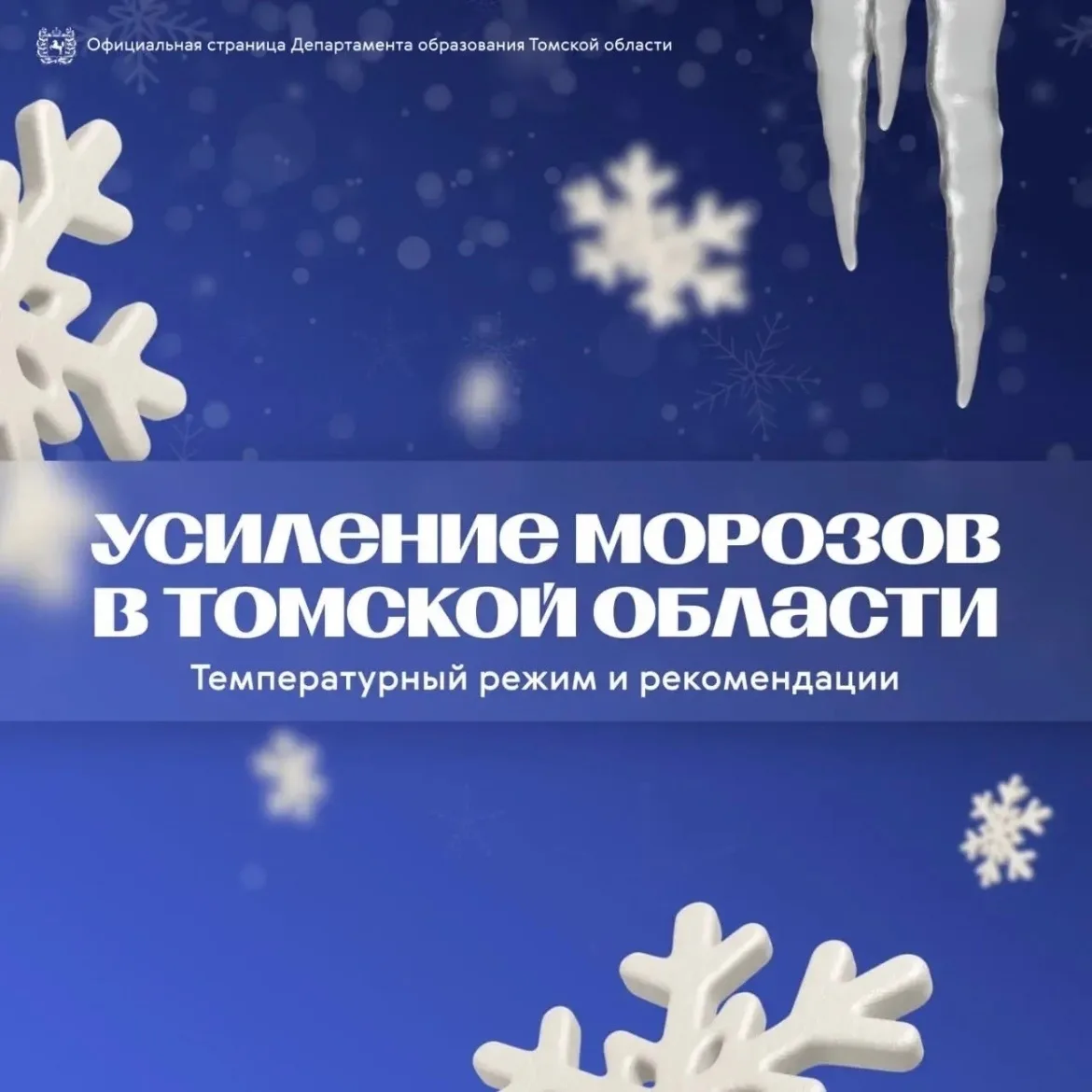 ❄️ Внимание, морозы! Департамент образования Томской области информирует о похолодании. Пик — 16 января: ночь до -40°C, день до -34°C.