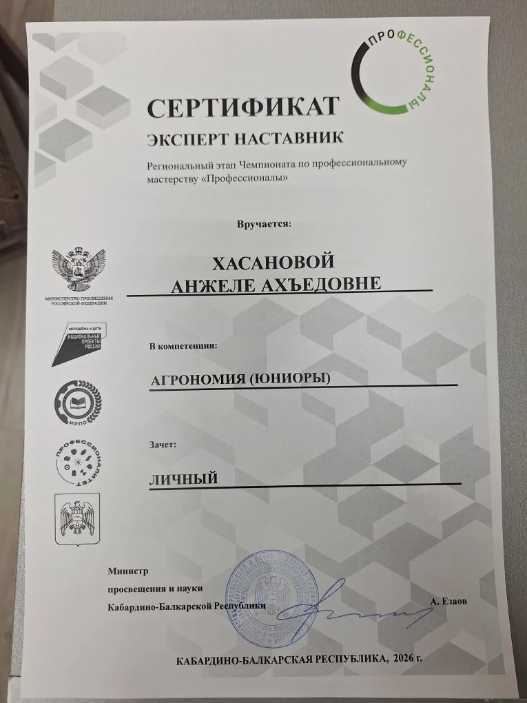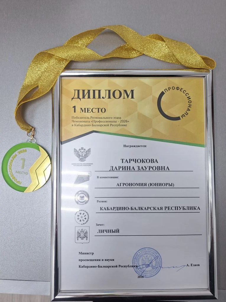 Поздравляем Тарчокову Дарину, ученицу 10 класса, которая заняла 1 место в Региональном этапе Чемпионата "Профессионалы-2026" в КБР, в компетенции АГРОНОМИЯ (ЮНИОРЫ)