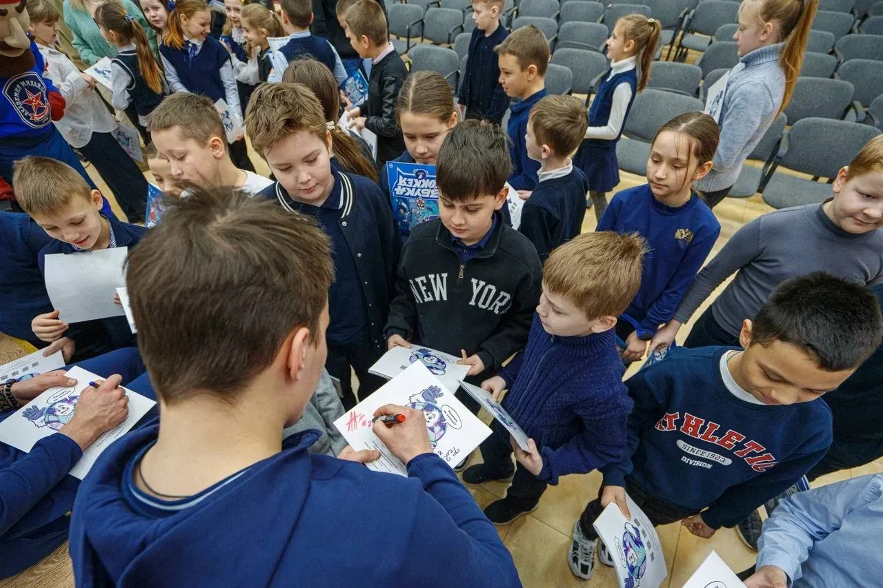 Аким Селивёрстов, Александр Андрияшев и Семён Фёдоров встретились с учениками, рассказали про хоккей и хоккейный клуб, оставили автографы и про подарки не забыли🔥
