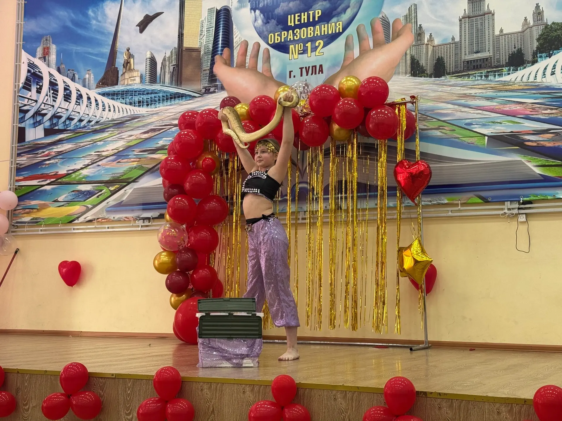 Особым сюрпризом стала живая змея, которая вызвала интерес и удивление у зрителей, а завершился праздник трогательным выступлением директора школы с песней «Золотое сердце». 🎤