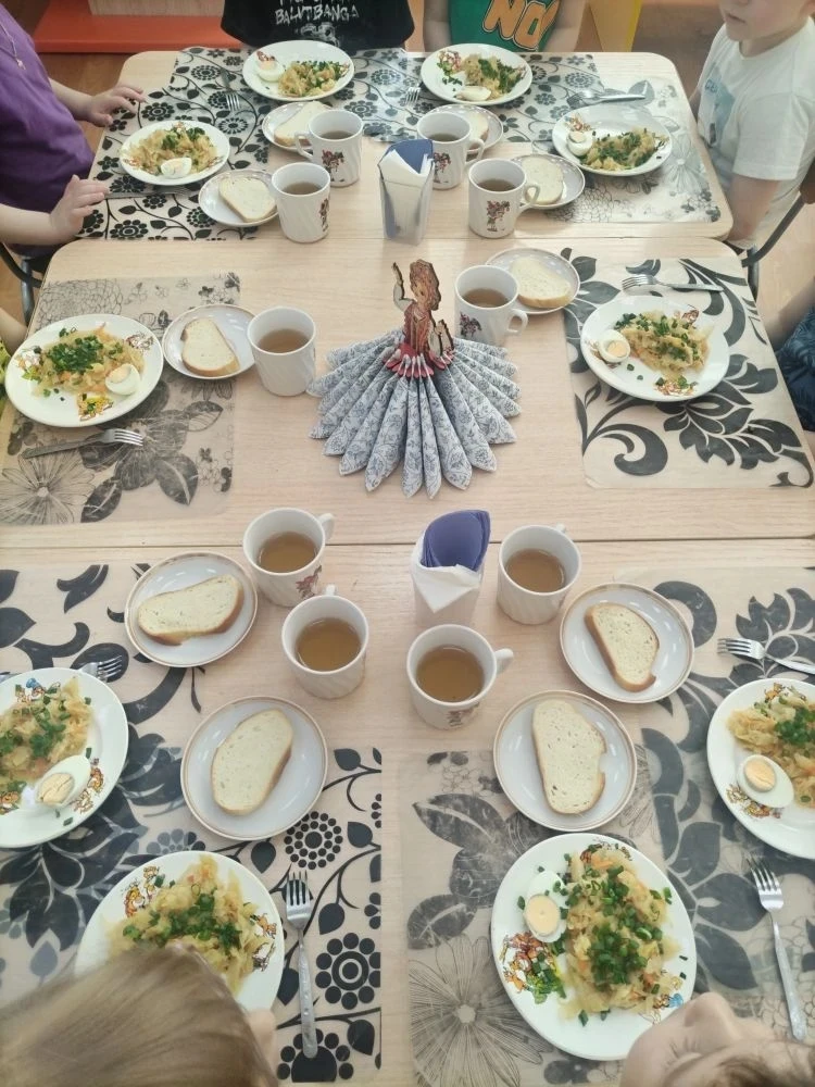 И вот зелёный лук появился у детей на столе. Они с удовольствием поели блюдо, украшенное зелёным луком.