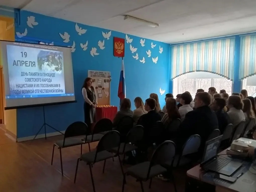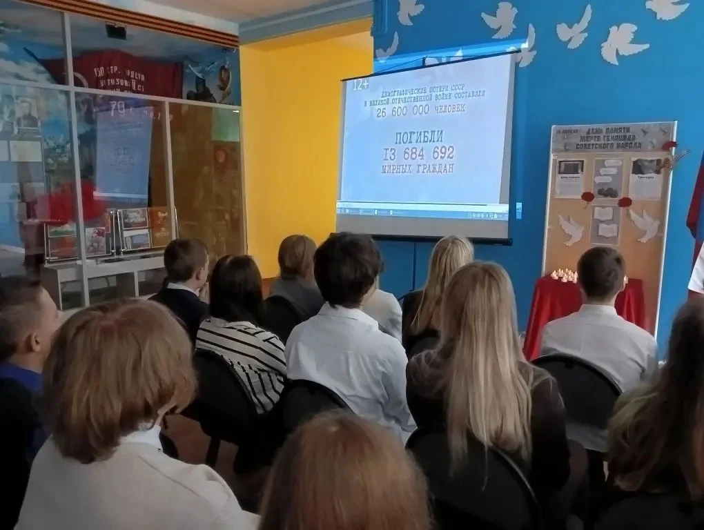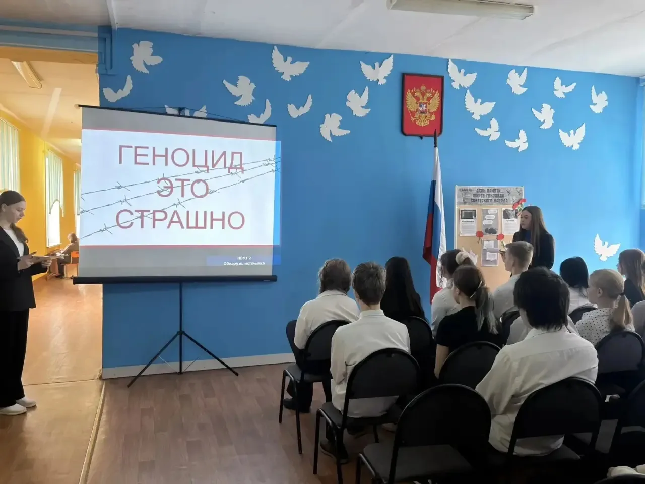 Ученики посмотрели фрагменты документальных фильмов и хроники военных лет. Эти кадры произвели на ребят сильное впечатление — невозможно остаться равнодушным, видя свидетельства тех страшных событий. В завершение мероприятия все присутствующие почтили память жертв геноцида минутой молчания — в абсолютной тишине каждый смог прочувствовать тяжесть тех лет и отдать дань уважения погибшим.