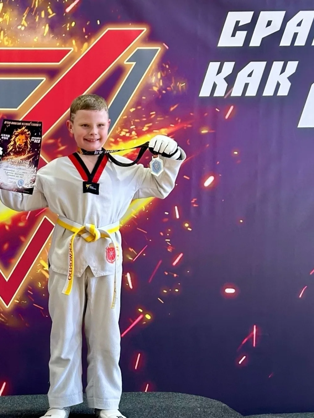 🥳 Поздравляем Лыженкова Максима, ученика 1 «В» класса, с блестящей победой на межрегиональном детско‑юношеском фестивале по тхэквондо ВТ «Сражайся как лев»!