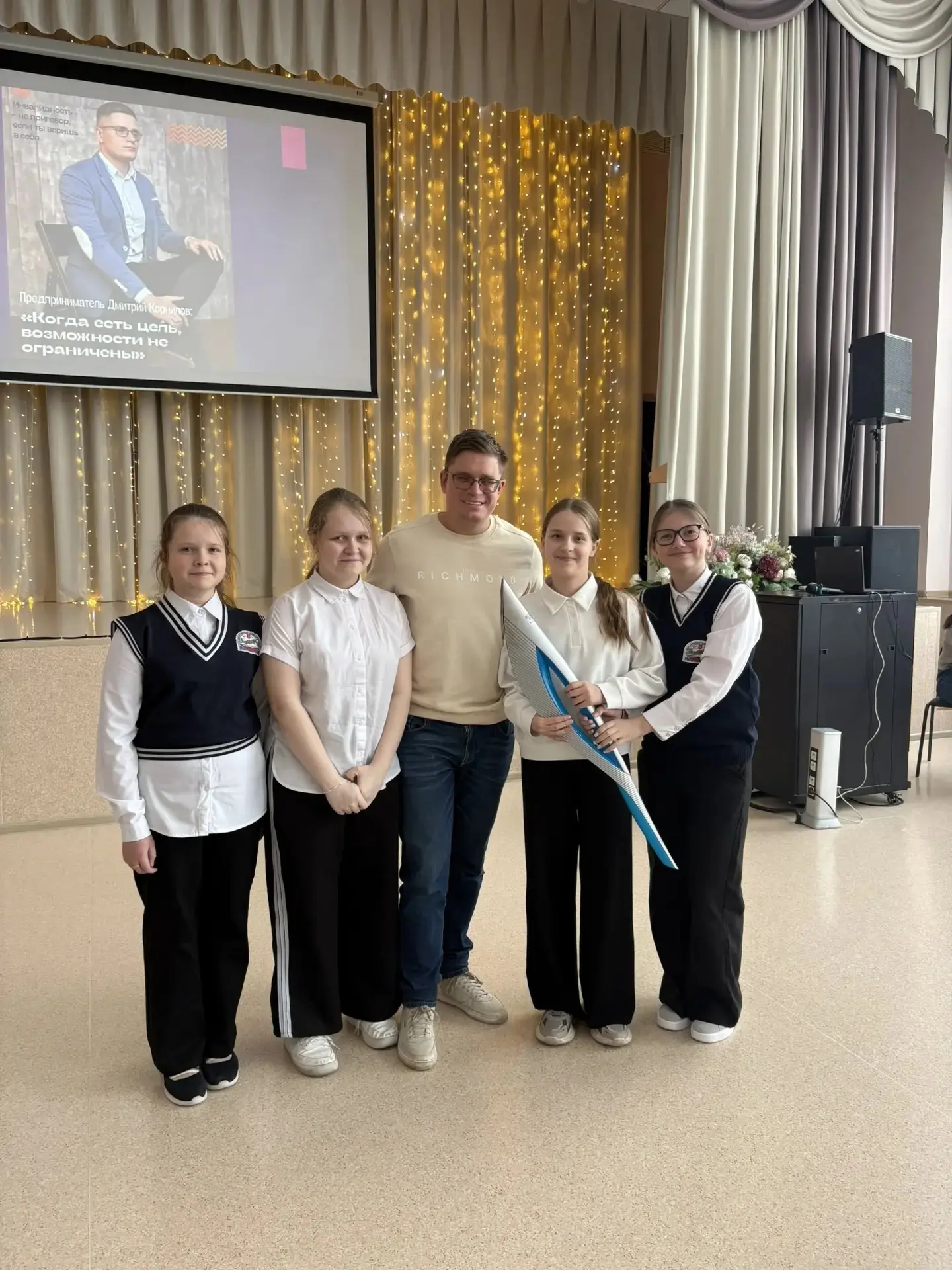 📌 В рамках проекта «Школа адаптивной воздушной гимнастики "Крылья возможностей"» состоялась встреча обучающихся 5-6 классов 5 корпуса с Дмитрием Александровичем Корниловым — мастером спорта международного класса по лёгкой атлетике, участником XIV Летних Паралимпийских игр в Лондоне (2012), многократным чемпионом России, Европы и мира среди спортсменов с нарушением зрения.