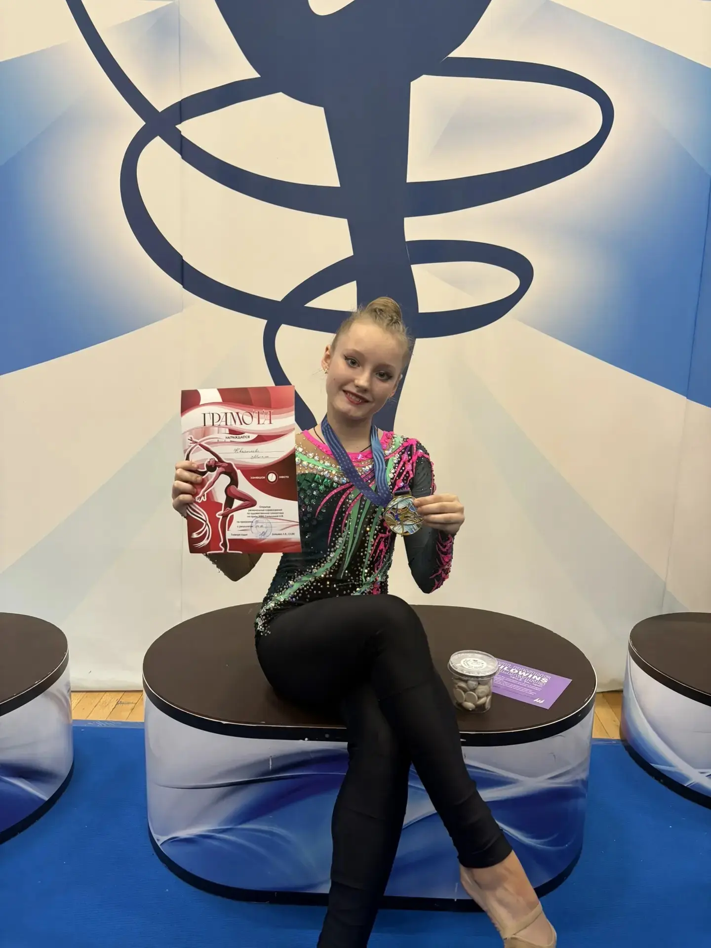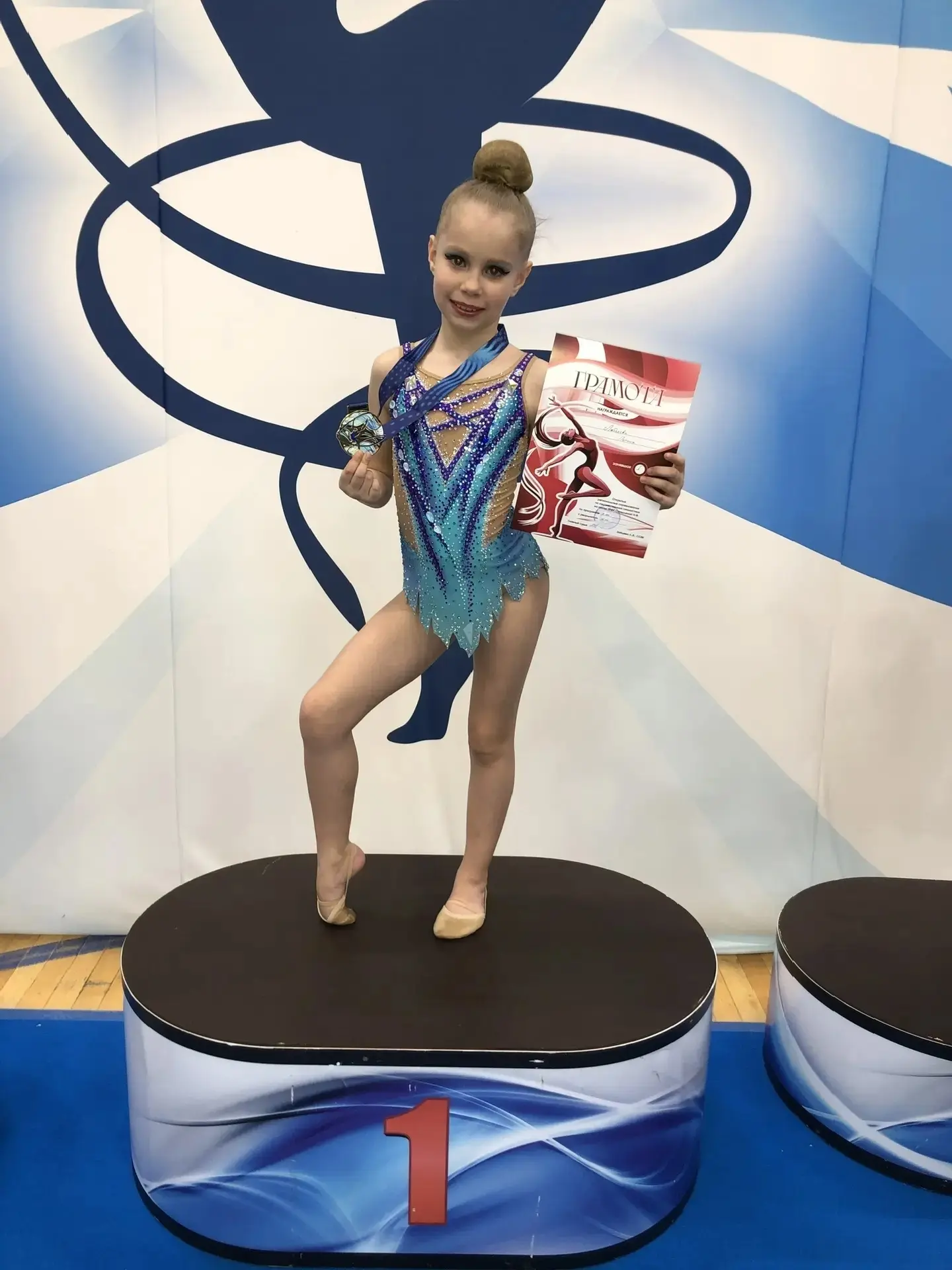 🥳 Любасова Полина, ученица 1 «Е» класса, приняла участие в Открытых региональных соревнованиях по художественной гимнастике и заняла почетное 1 место🥇
