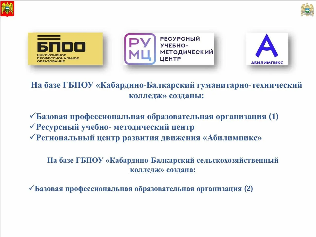 ГБПОУ «Кабардино-Балкарский гуманитарно-технический колледж» (являясь Центром развития движения «Абилимпикс» в Кабардино-Балкарской Республике (в соответствии с приказом Министерства образования, науки и по делам молодежи КБР от 15.06.2016 №762), Базовой профессиональной организацией (приказ Министерства образования, науки и по делам молодежи КБР от 07.04.2017 №434), Ресурсным учебно- методическим центром (приказ Министерства просвещения, науки и по делам молодежи КБР от 28.09.2018 №711)