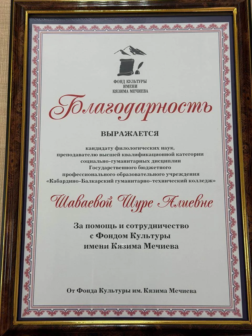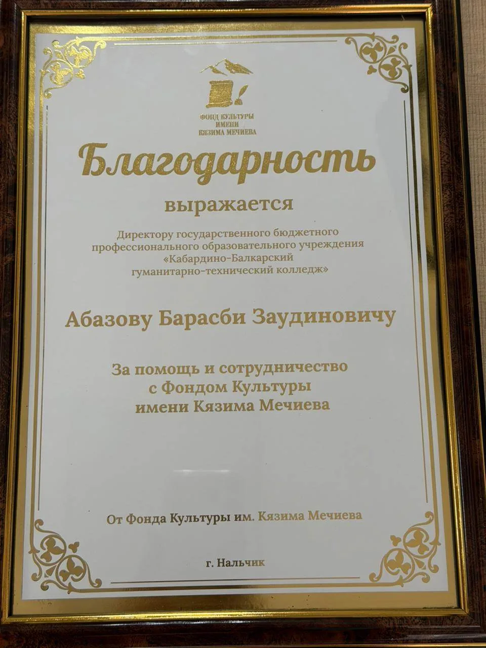 Лариса Аппаева выразила слова благодарности в адрес директора ГБПОУ «КБГТК» Барасби Заудиновича Абазова и преподавателя Шаваевой Шуры Алиевны за помощь и сотрудничество с Фондом Культуры имени Кязима Мечиева.