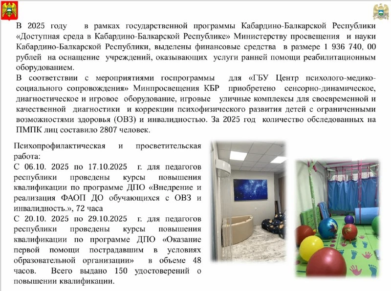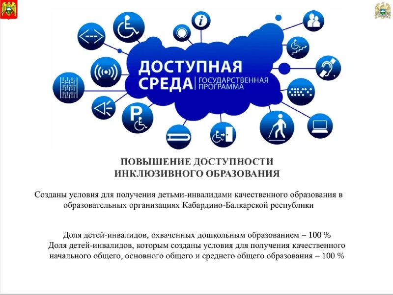 Доступная среда (безбарьерная среда) важна, так как позволяет людям с инвалидностью вести независимый образ жизни и полноценно участвовать во всех сферах общества. Это не только физическая доступность зданий (пандусы, подъёмники, тактильные указатели), но и адаптация услуг, информации и коммуникаций.Для решения этих задач в Кабардино-Балкарской Республике реализуется государственная программа «Доступная среда в Кабардино-Балкарской Республике». Её цели — формирование безбарьерной среды и повышение доли доступных объектов до 100% к 2030 году.Доступность — это многогранное понятие, которое охватывает различные сферы жизни и способствует улучшению качества жизни для всех, независимо от их физических или когнитивных особенностей. Только вместе мы сделаем мир доступнее Некоторые значимые достижения предоставлены на слайдах.