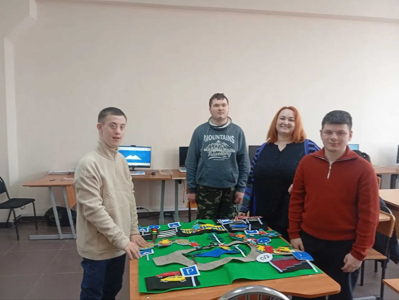 В группе по адаптированной программе профессионального обучения провели увлекательный урок по изучению правил дорожного движенияКоврограф ПДД - это многофункциональное игровое пособие, используемое для обучения правилам дорожного движения. Оно представляет собой ковролиновую основу с прикрепляемыми элементами, помогая моделировать дорожные ситуации, изучать знаки, сигналы светофора и безопасное поведение на дороге. Ключевые особенности и применение:Игровой формат: Позволяет детям визуально моделировать дорожные ситуации: перекрестки, пешеходные переходы, остановки транспорта.Развитие навыков: Формирует у детей представление о правилах поведения для пешеходов и водителей, тренирует внимание и безопасные привычки.Элементы: Включает в себя фигурки машин, дорожные знаки, светофоры, изображения пешеходов и детали дорожного полотна.Цель: Снижение рисков дорожно-транспортных происшествий.Такое пособие помогает в игровой форме усвоить основные понятия ПДД, такие как «пешеходный переход», «островок безопасности» и сигналы светофора.Одним из элементов занятия было указать, где знаки стоят верно, а где не правильно, ребята могли сами придумать истории и расставить элементы на полотне Занятие провела руководитель БПОО - Сатаней Курашева