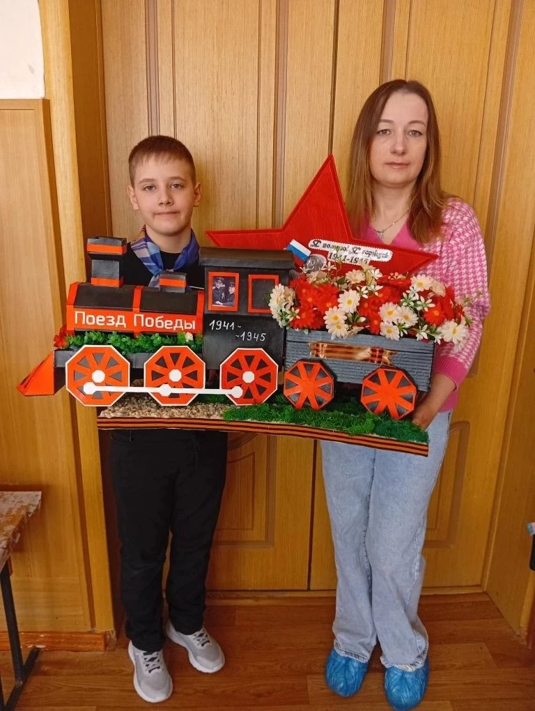 Особого восхищения достойна необыкновенная работа «Поезд Победы» от Иванкова Максима (4 В) и его мамы, Валентины Михайловны! Ваша совместная работа — прекрасный пример семейного творчества и уважения к истории.