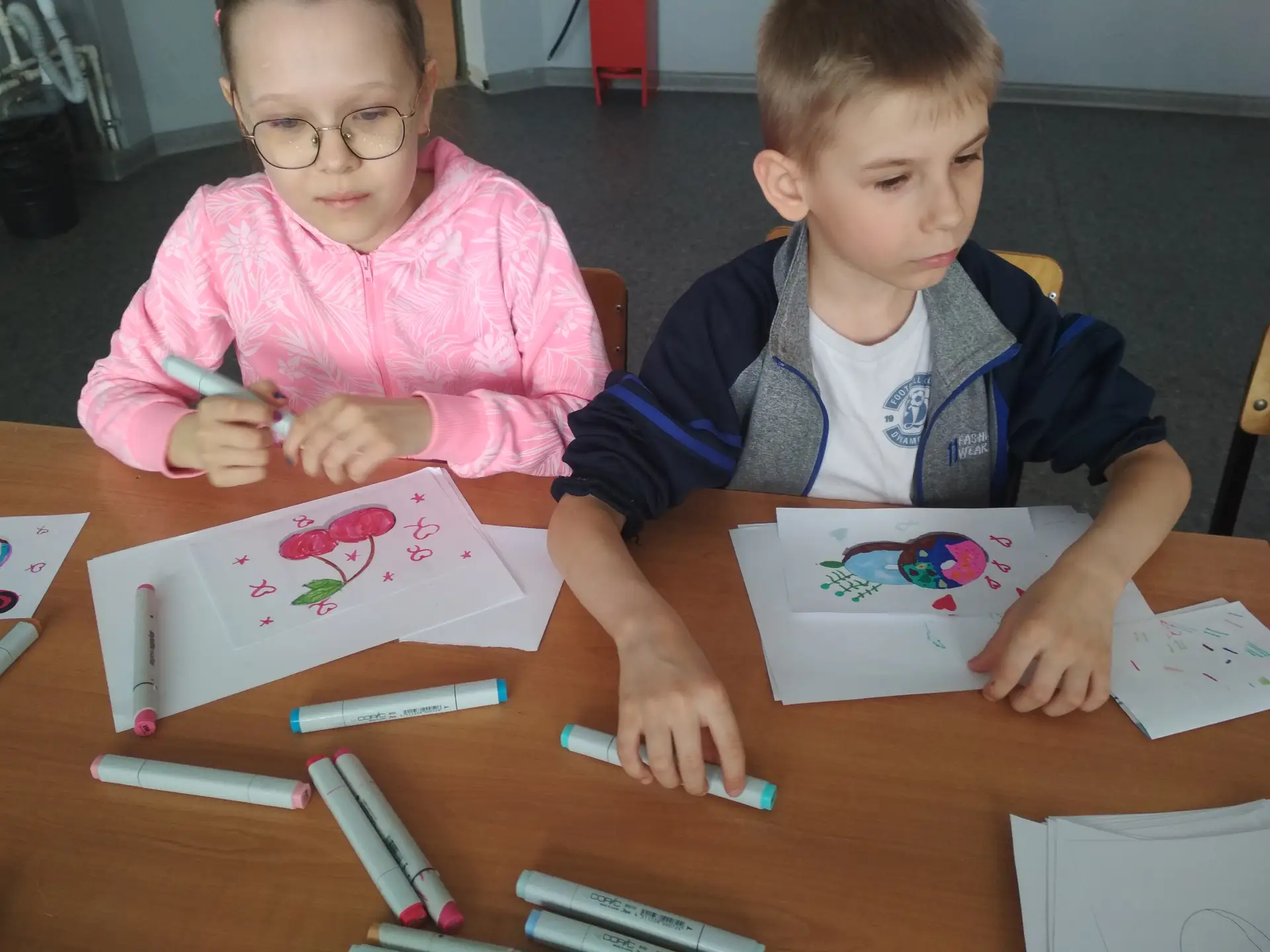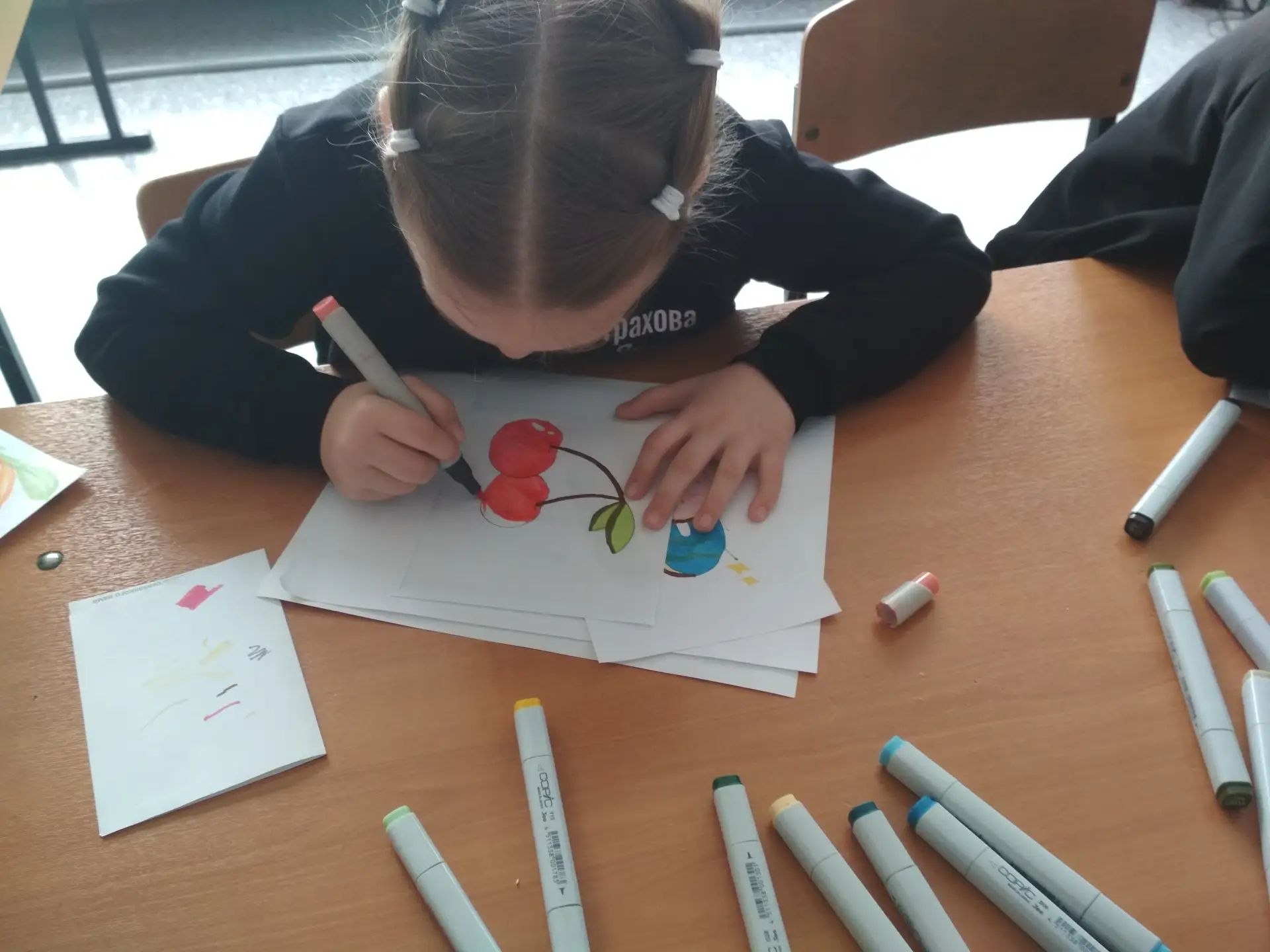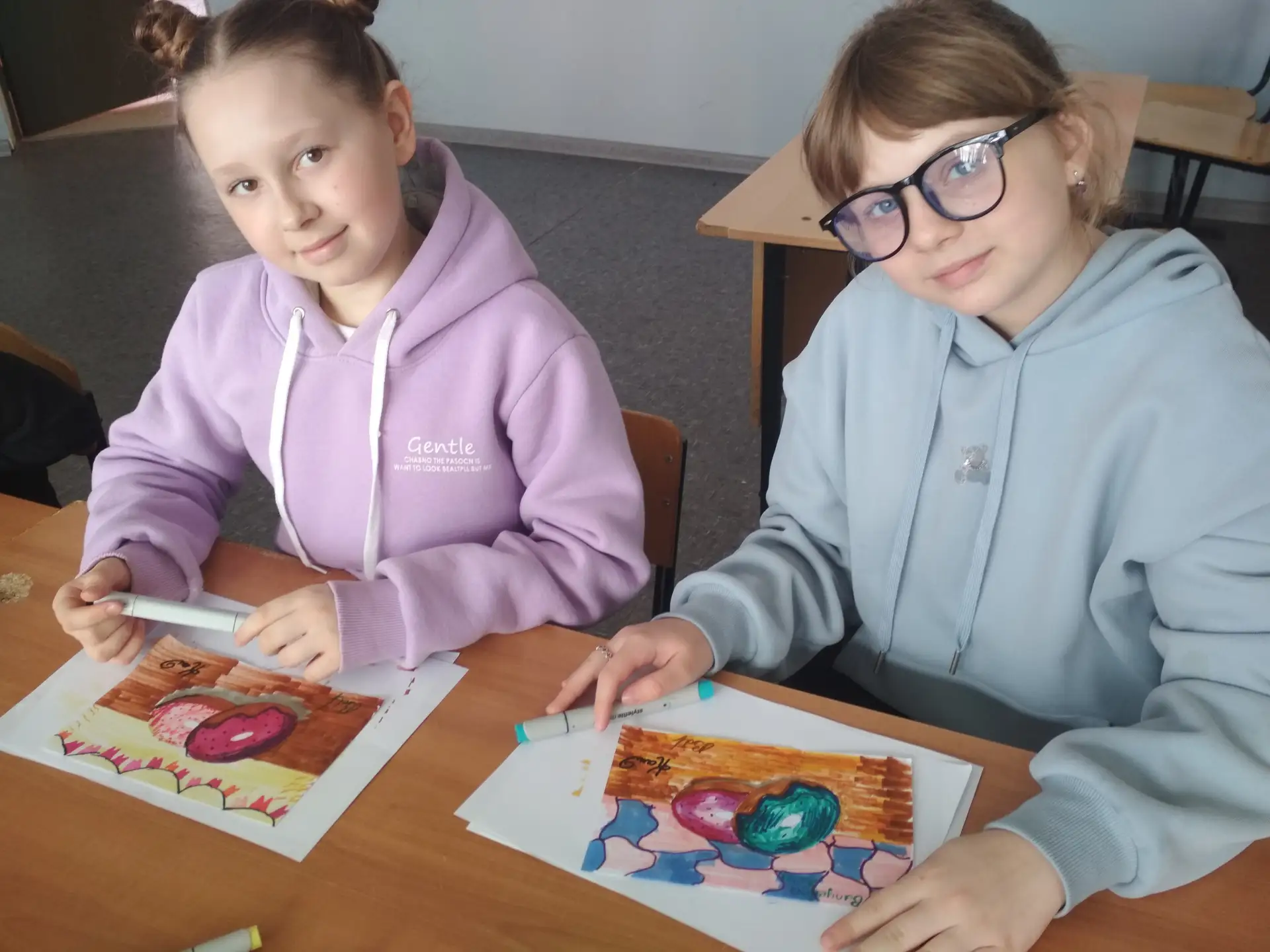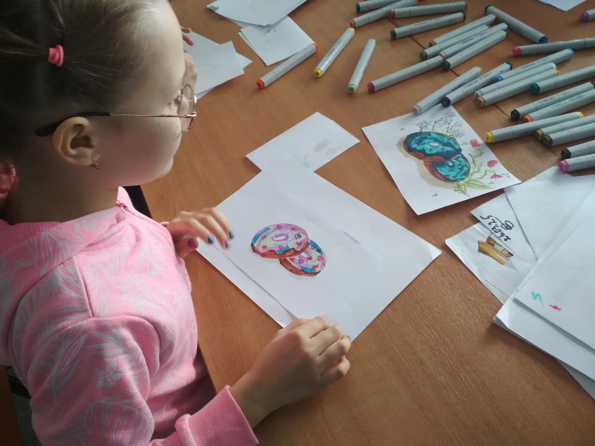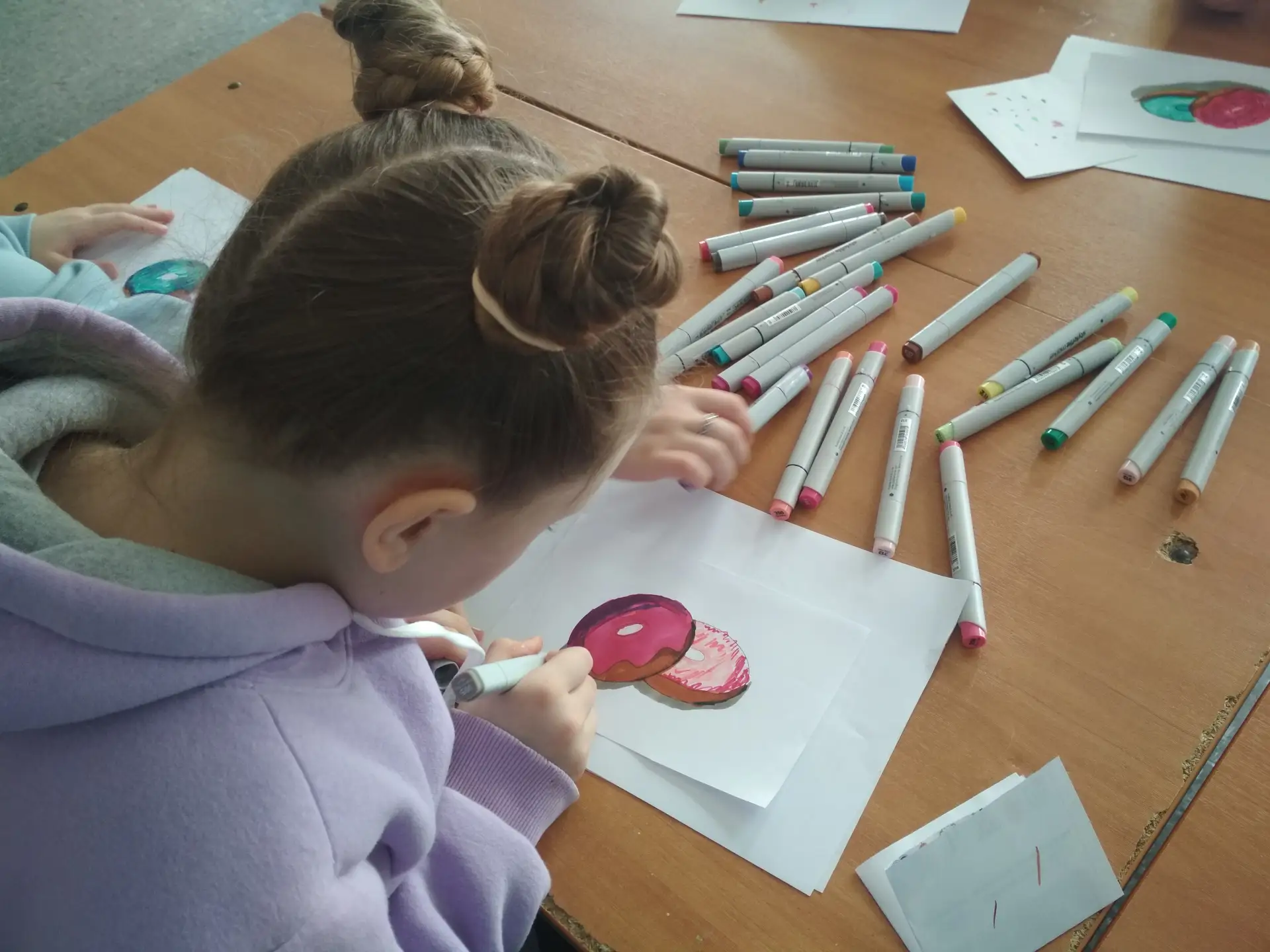 Обучающиеся выполнили наброски пончика и брошки-вишенки, воплотив своё видение данных предметов.