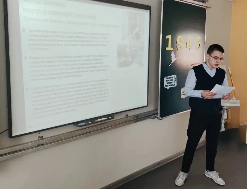 Ученики 8В класса под руководством Завдовьевой Е.А. приняли участие в масштабном мероприятии — уроке «Это время памяти», приуроченном к трагическим событиям Великой Отечественной войны. Урок стал частью проекта «Без срока давности», направленного на отражение ужасов геноцида, учинённого нацистскими захватчиками и их союзниками по отношению к мирному населению СССР. В ходе занятия учащиеся познакомились с фактами массовых расстрелов, изнурительных маршей, голода и жестокого обращения с гражданскими. Особое внимание было уделено судьбам женщин, детей и стариков — тех, кто остался без защиты. Эти люди не имели возможности сопротивляться. Каждый факт, озвученный педагогом, становился шагом к восстановлению исторической правды, уходящей корнями в прошлое, но не теряющей своей актуальности сегодня.