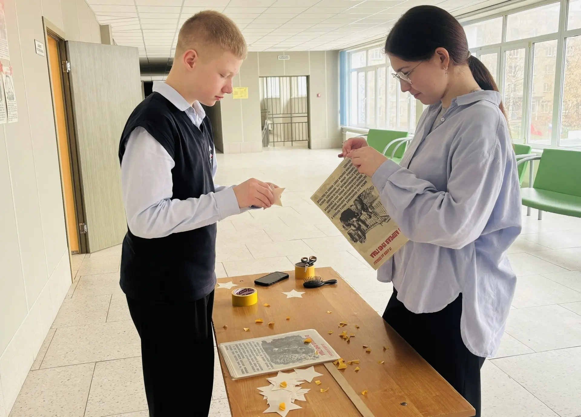 Сегодня, в первый день Весенней недели добра, команда волонтеров, объединенная национальным проектом "Молодежь и дети", приступила к важному делу. Ребята завершили украшение информационного стенда "100 дней до Победы". Это был не просто процесс декорирования, а настоящее погружение в историю, требующее аккуратности и внимания к деталям. Каждый элемент стенда – это символ, который мы бережно создавали. Волонтеры с особой тщательностью вырезали красные звезды, которые затем находили свое место на информационных листах. Работа оказалась весьма трудоемкой. Прежде чем звезды украсили стенд, каждый листок инсталляции проходил через процесс ламинирования, чтобы сохранить свою целостность и красоту надолго. Затем волонтеры аккуратно приклеивали все элементы, добиваясь четкого расположения и гармоничного вида. Этот кропотливый труд занял немало времени, но мы уверены, что результат будет положительным. Ведь каждая звезда, каждый аккуратно приклеенный листок – это дань уважения подвигу наших предков, напоминание о важности мира и нашей общей ответственности за сохранение памяти о тех, кто подарил нам эту Победу. Сегодняшний день стал отличным стартом нашей Весенней недели добра, показав, как много можно сделать, когда сердца объединены благородной целью.