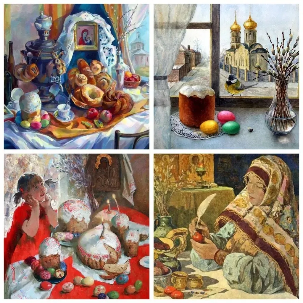 На пасху принято готовить особенную еду, которую затем рано утром освящают в церкви. Кулич - главное пасхальное блюдо. Пасхальный кулич символизирует хлеб, который Иисус разделял с учениками после воскресения. Настоящий русский кулич - высокий, цилиндрической формы. В тесто для кулича добавляют изюм или цукаты. Верх кулича поливают белоснежной глазурью и украшают буквами ХВ - "Христово Воскресение".