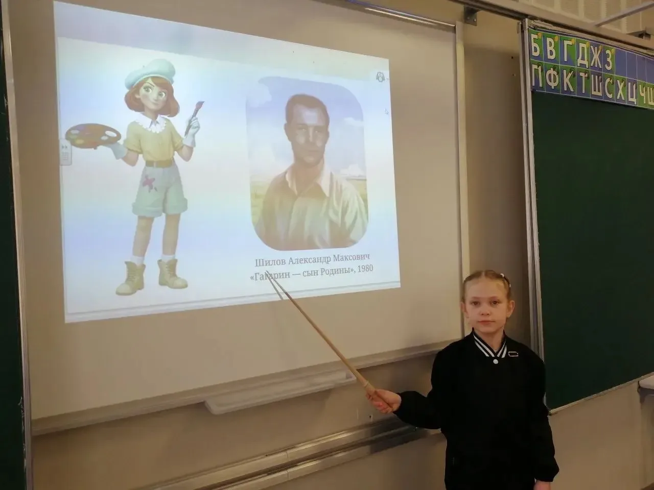 Тема космоса так вдохновила художников, что Русский музей и музеи - партнёры собрали большую подборку произведений о Гагарине, Терешковой, стартах ракет и мечте о космосе. Космос в рисунке - это не только звезды. Это ощущение полёта, света и движения. Третьеклассники познакомились с работами известных художников на тему космоса : Басов В. Н. "Здравствуй, Земля" (1961), Прокопенко А. А. "Будущий космонавт" (1962), Мазитов А. Н. "Чайка (Портрет В. В. Терешковой)" (1964), Бурак А. Ф. "Возвращение. Посадка" Восхода - 2" на Урале"(1967), Походаев Ю. А." В космос "(1976), Шилов А. М." Гагарин - сын Родины "(1980), Леонов А. А." Нивы Алтая. Часть диптиха "(1981), Плотнов А. И." На Родине Гагарина "(1982), Соколов А. К." Стартует Восток. Поехали "(1985), Окороков Б. В." На новые орбиты" (1986).