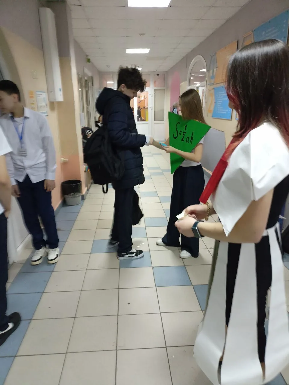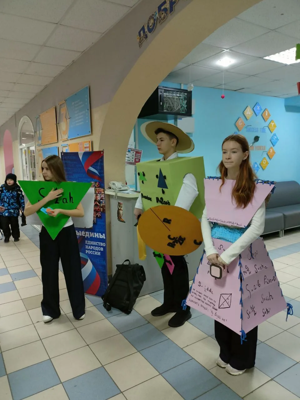 В первый день гимназистов у входа встречали «Эйнштейн» и геометрические знатоки, вручая ребятам и педагогам мудрые мысли знаменитых людей о точных науках.