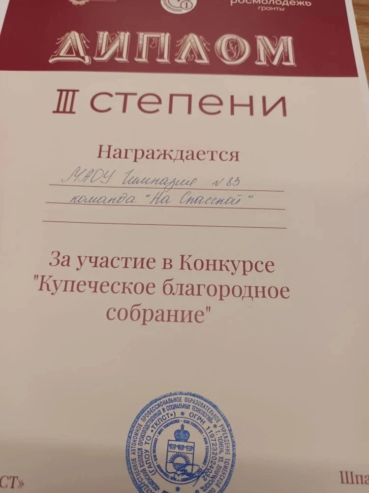 25 февраля в Мультицентре "Контора пароходства" прошло итоговое мероприятие проекта экскурсионной квест-игры "Купеческая Тюмень" - "Купеческое благородное собрание". Конкурс состоял из 5 раундов, каждый из которых содержал задания по краеведению и был связан с купечеством XIX-XX вв. Команда гимназии "На Спасской" заняла 3 место в достойном сражении знатоков истории родного города, получила в подарок 5 книг по истории Тюмени и сувениры проекта. Конкурс был организован "Тюменским колледжем производственных и социальных технологий", этот проект в 2024 г. стал победителем Всероссийского конкурса Росмолодежь.гранты и в течение полугода в рамках него проводились экскурсии и настольные игры. Итоговое мероприятие стало незабываемым и проходило в отреставрированном в 2019 г. складе тюменских судовладельцев XIX века Колмаковых. Сейчас "Контора пароходства" - место реализации молодёжных инициатив Тюмени и важный арт - объек, центр всеобщего интереса. #Росмолодежь