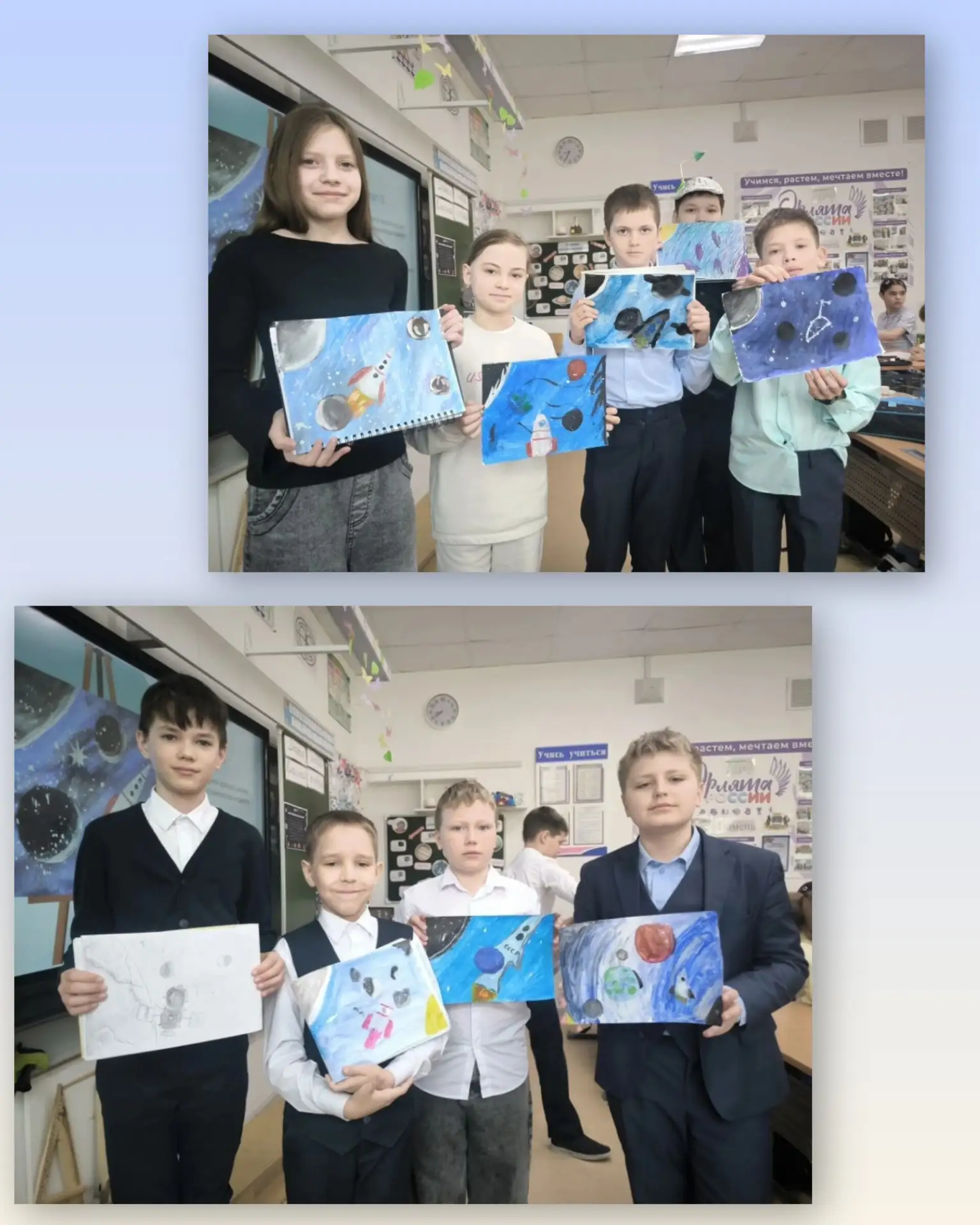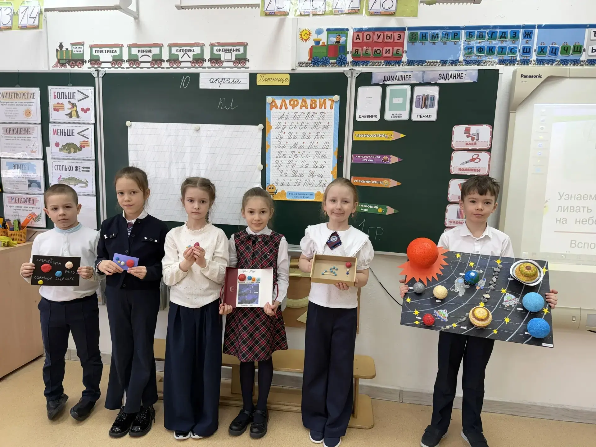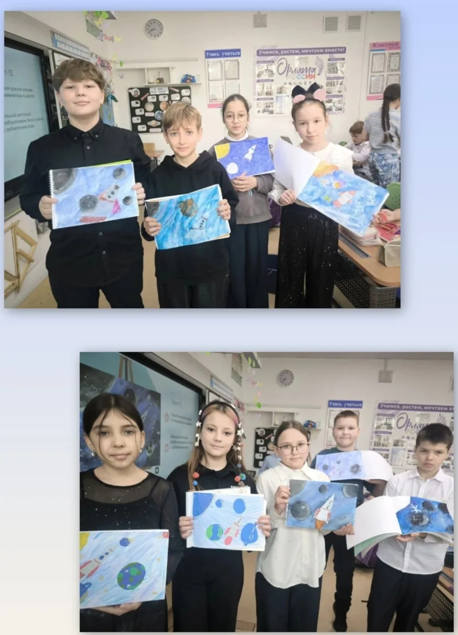 6 апреля в 4Б классе началась неделя Космонавтики. Ребята принесли необыкновенные поделки, посвященные космосу, а на уроке русского языка прошел "Космический диктант". Во вторник Светлана Михайловна оформила для ребят уголок "Интересные факты о космосе". В среду у детей состоялся "Математический космический диктант", а в четверг - "Космическое списывание" по русскому языку. Победители конкурсов награждены памятными дипломами. На уроке технологии ребята изготовили космические талисманы со своими знаками зодиака. А в завершении недели дети подобрали себе фантастические образы и нарисовали космос. Неделя пронеслась молниеносно! Благодарим нашего учителя за такую насыщенную и увлекательную программу!