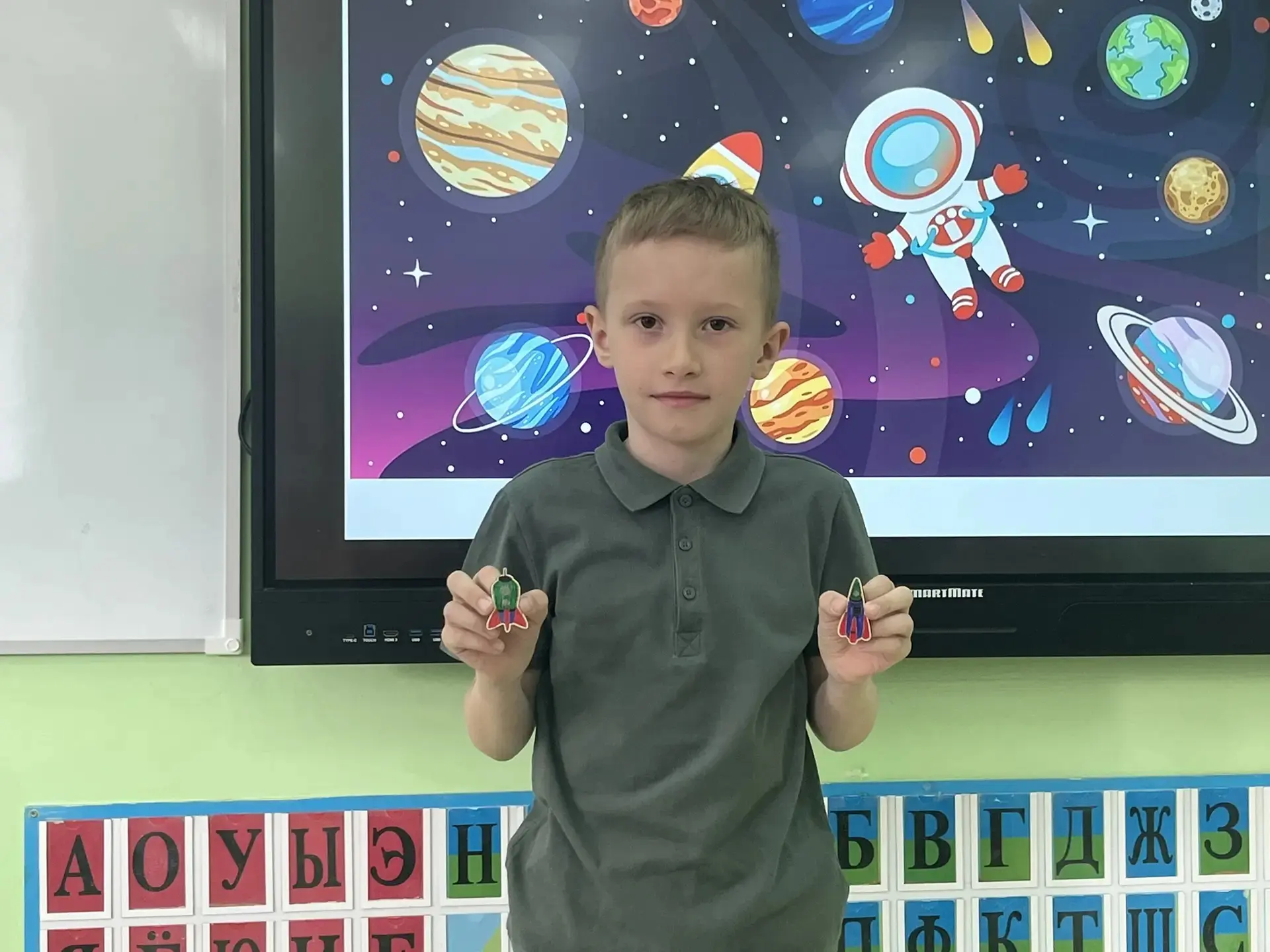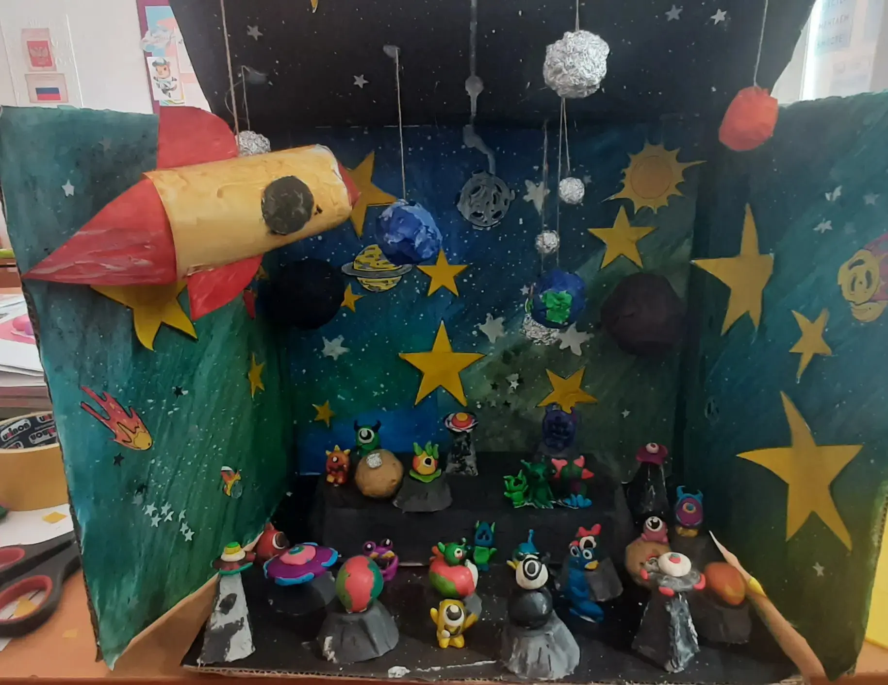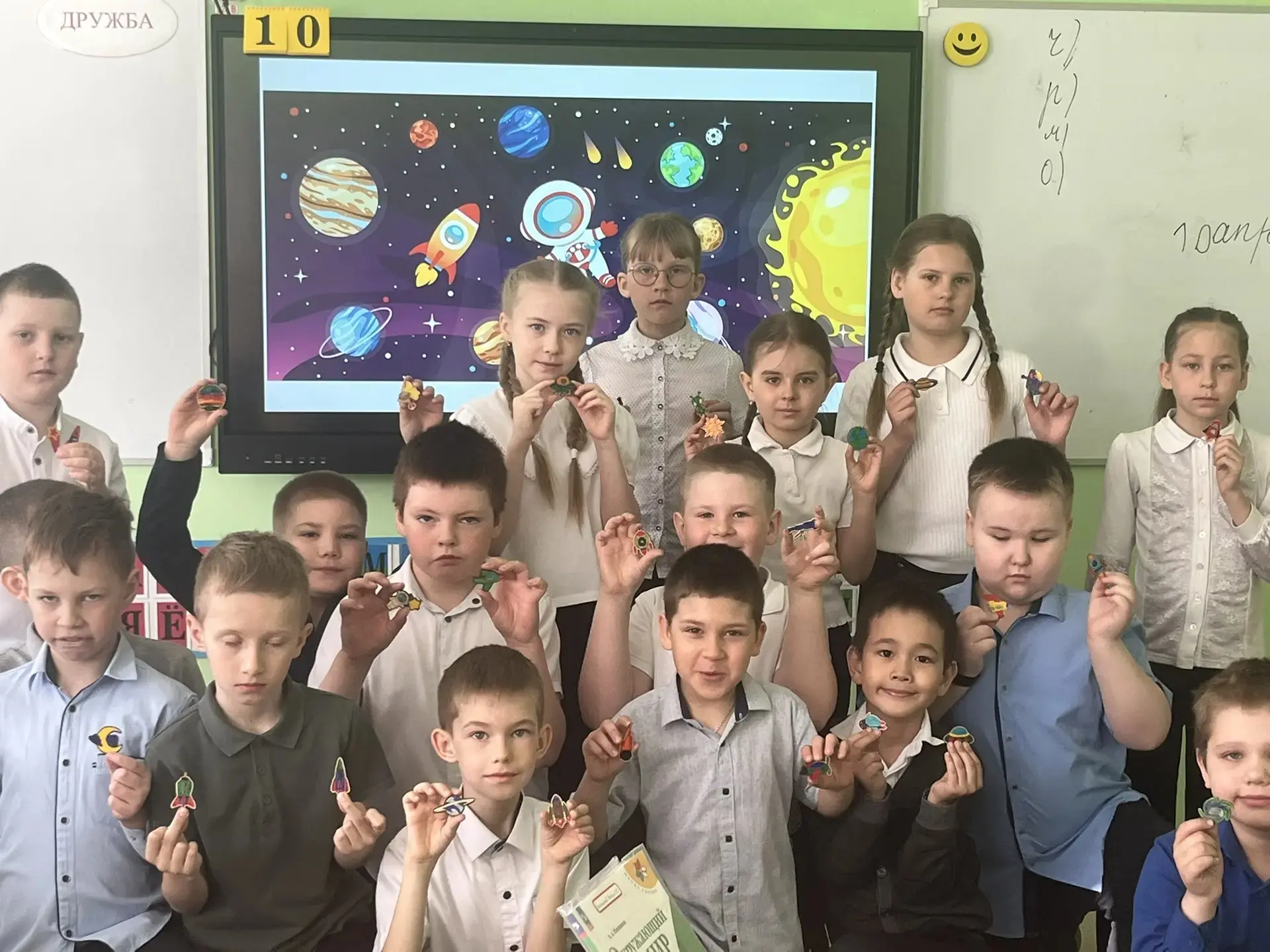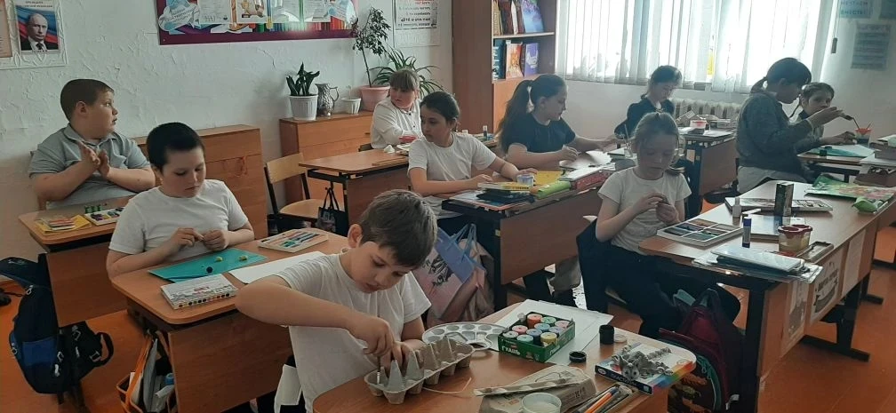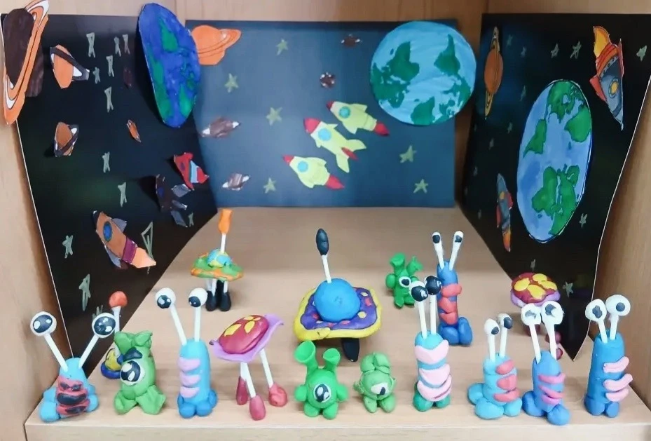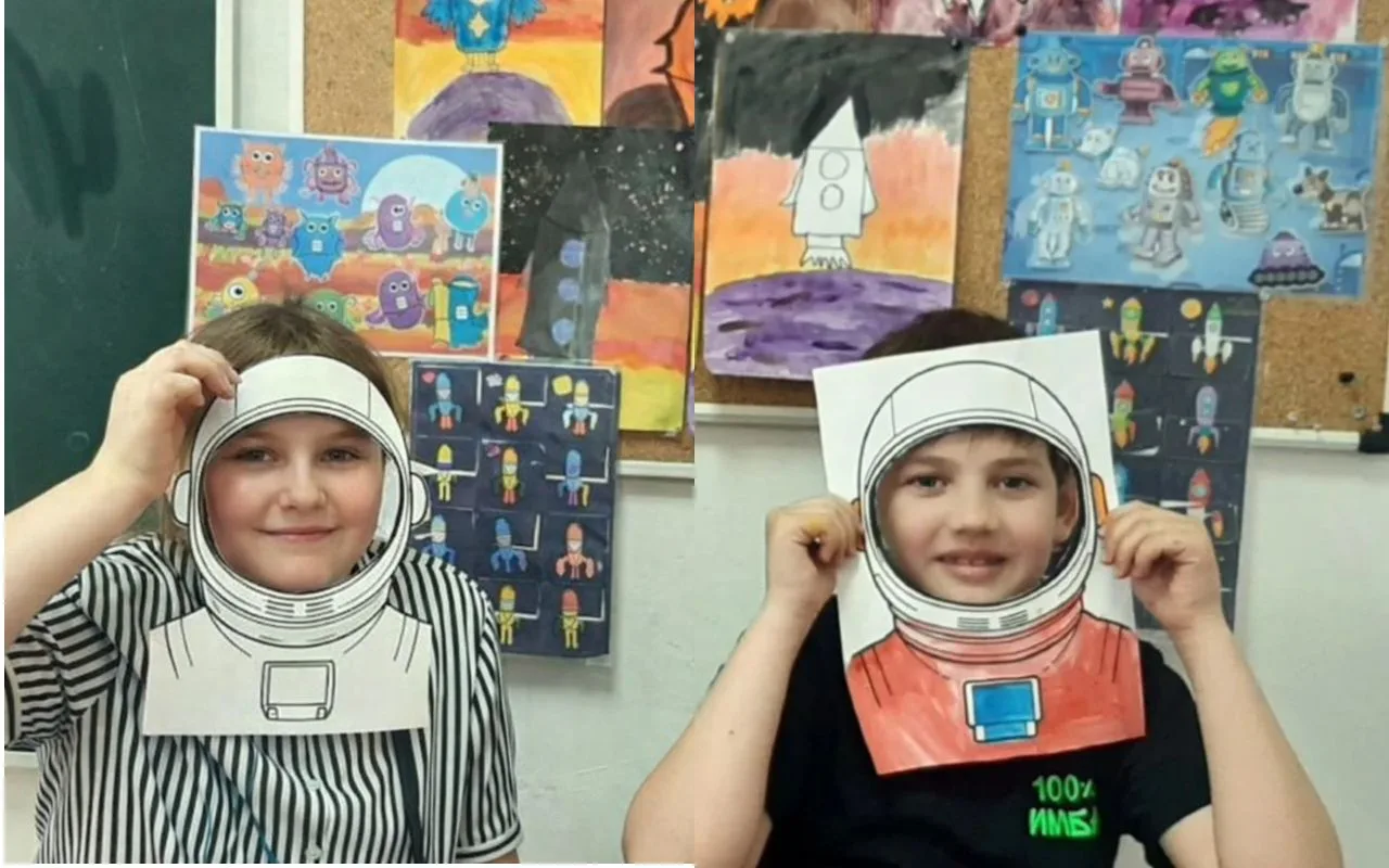 Чего там только нет! Далёкие планеты, быстрые ракеты, любопытные луноходы и, конечно, улыбающиеся звёзды. Малыши из 2 класса рисовали, лепили космонавтов и животных, а ученики 4 класса помогали с композицией и деталями — вместе получился настоящий звездный флот!