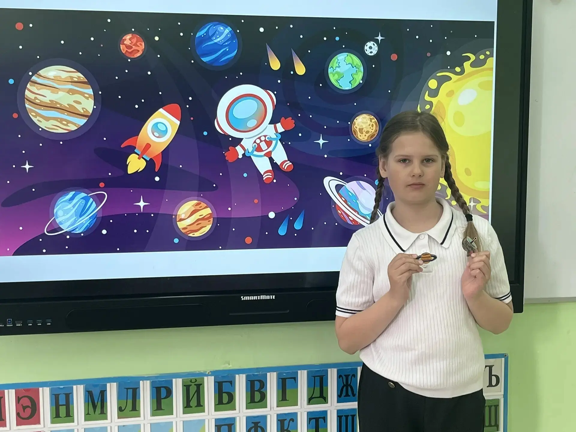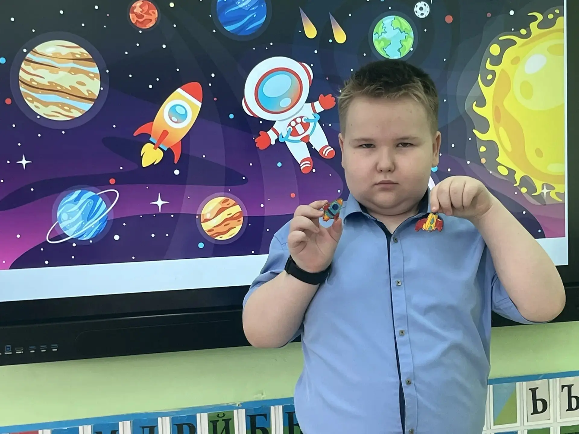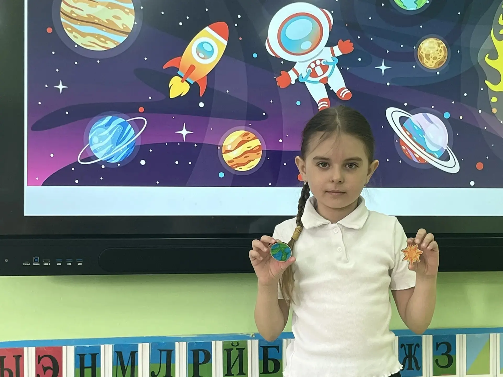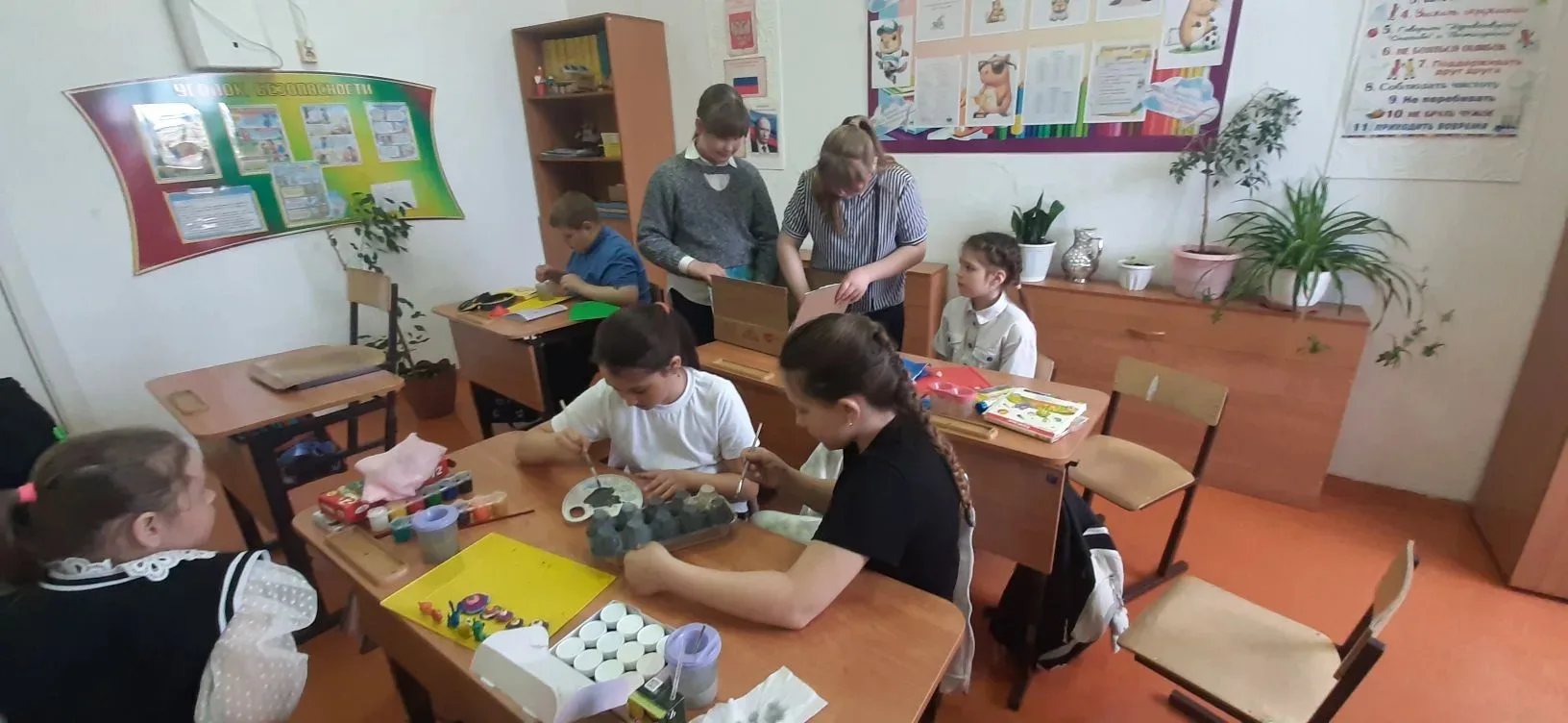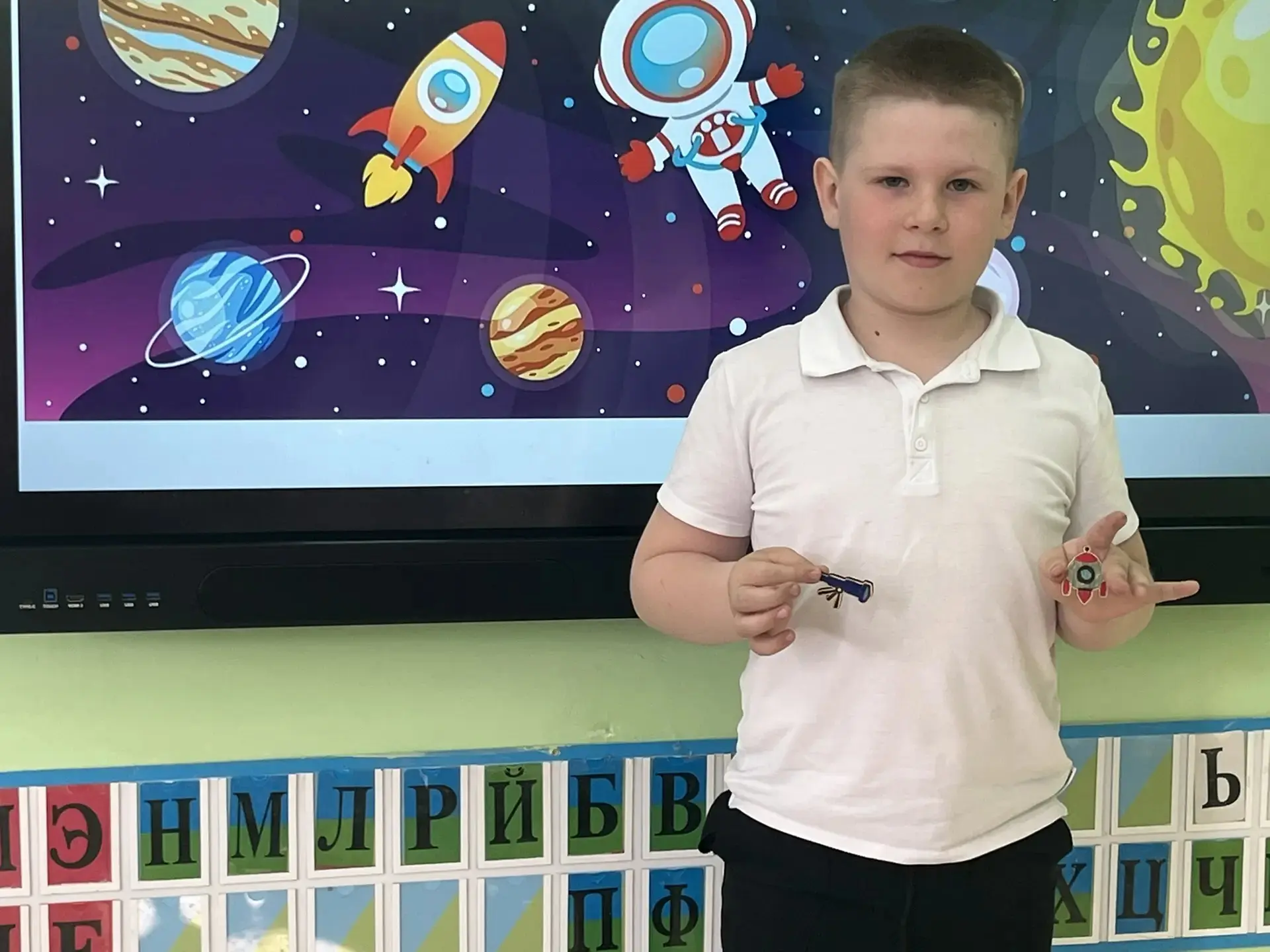 Чего там только нет! Далёкие планеты, быстрые ракеты, любопытные луноходы и, конечно, улыбающиеся звёзды. Малыши из 2 класса рисовали, лепили космонавтов и животных, а ученики 4 класса помогали с композицией и деталями — вместе получился настоящий звездный флот!